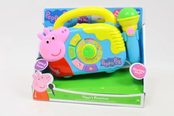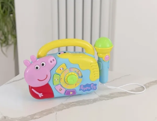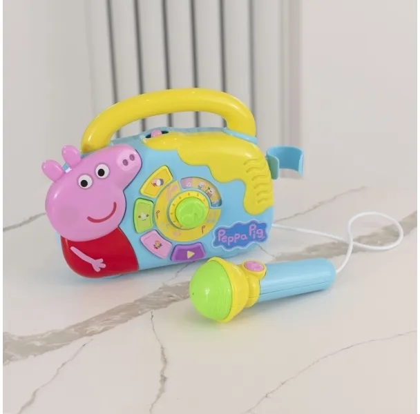 This Peppa Boombox is ready for lots of fun! Choose your song on the radio and layer up different instruments on top of your selected song to make it your own. Use the built-in microphone to sing along to your favourite songs. Music includes 'The Wheels on the Bus', This Old Man Song' and the 'Peppa Pig Theme Tune'. Includes eye-catching flashing lights to enhance playtime experience and a handy carry handle for tunes on the go! The kid-friendly and easy to use controls are designed especially for little music lovers and will definitely be entertaining for parents too!