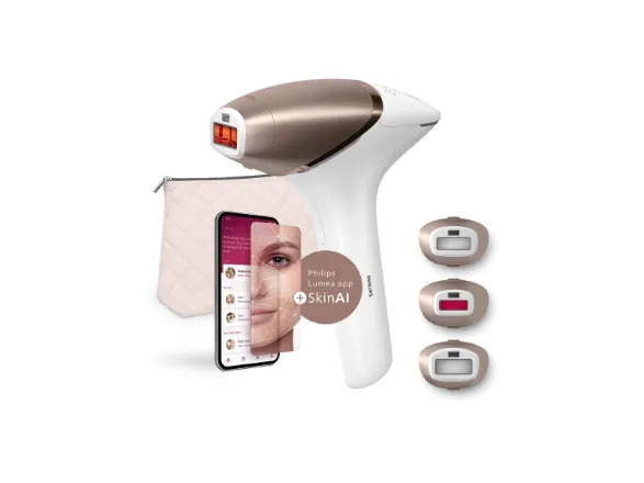 The Philips Lumea IPL 9900 Series offers an approach to hair removal through Intense Pulsed Light (IPL) technology, suitable for various skin tones including light pale white, white fair, medium white to olive, olive mid-brown, and dark brown. This hair removal system is designed for both face and full body treatments, providing a solution with a light module lifetime of 450,000 flashes. The cordless operation enhances user convenience, allowing for hassle-free usage across different body areas. Equipped with SenseIQ technology, a skin sensor, and a skin tone sensor, this system personalizes treatment for safety and efficiency. The device features five adjustable light energy settings, ensuring a tailored experience for every individual. Included with the device are essential personal care accessories such as a storage pouch, power adapter, cleaning cloth, and specialized attachments for facial, body, and precision areas. The facial attachment has a light area of 2 sq.cm, while the body attachment covers 4.1 sq.cm, and the precision attachment serves a 3 sq.cm area, making it versatile for various hair removal needs. With a full charge time of 100 minutes and indicators to show charging and readiness, the Philips Lumea IPL 9900 Series combines functionality and ease of use, providing an effective hair removal solution for your beauty routine.