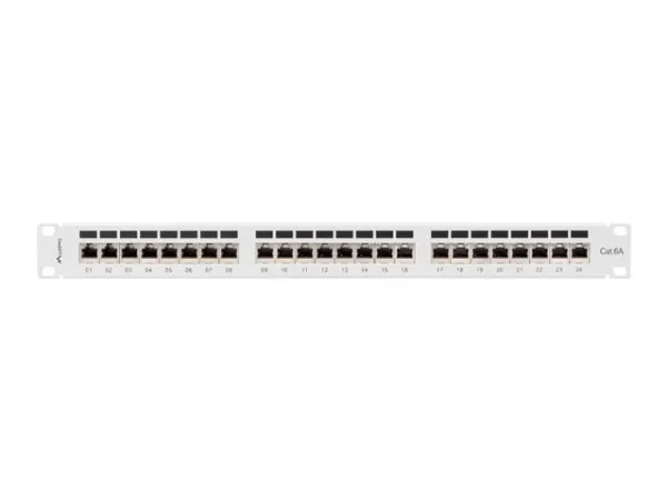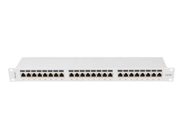 This particular patch panel is designed to use in main and secondary distribution points of fast telecommunications systems. It is a passive part of structured cabling used for termination and organization of twisted-pair cables within 19" rack cabinets. Patch panels is equipped with 24 shielded RJ-45 ports category 6a. Use of IDC/LSA connectors, provides fast and easy installation. Cable management panel attached to this product, ensures easy assembly. Stiffened shelf with handles allows easy organization of cables and stability of assembly.