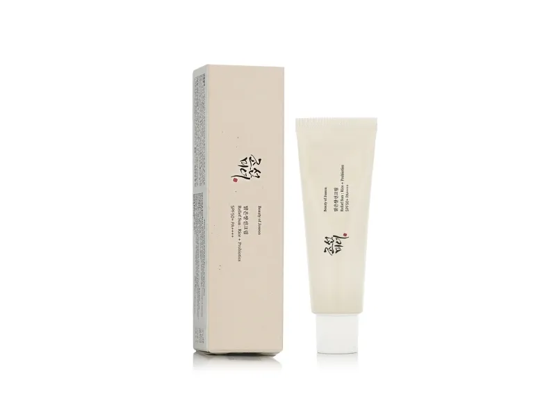 Relief Sun: Rice + Probiotics fra Beauty Of Joseon indeholder også niacinamid, adenosin og vitamin E, som er foryngende ingredienser, der hjælper med at reducere bumser, ujævn hudtone, store porer, fine linjer og rødme.