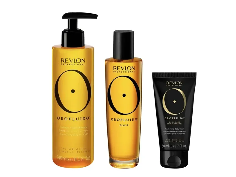 REVLON Orofluido Wellness Set kosmetiksæt har tilnavnet flydende guld Indeholder hårolie, shampoo og bodycreme