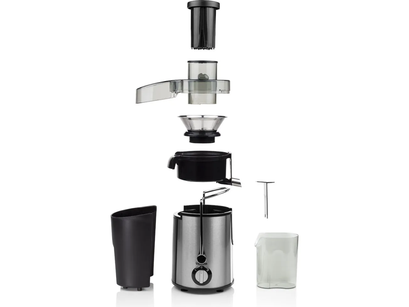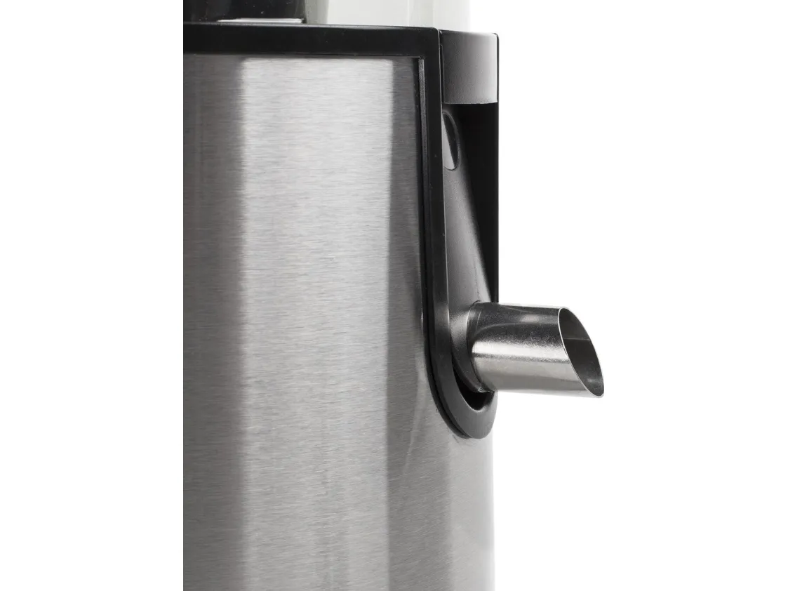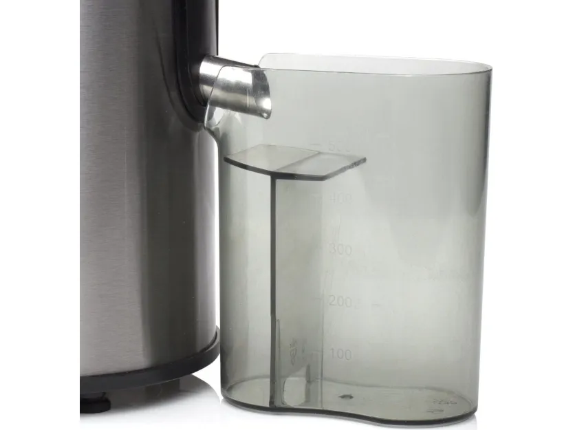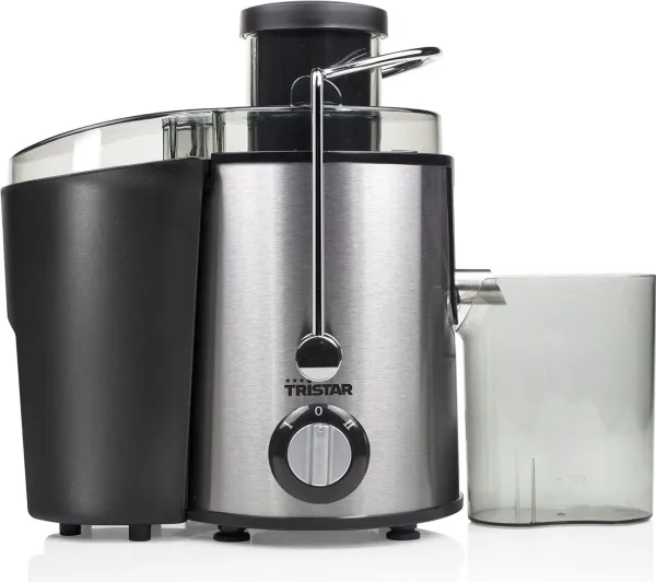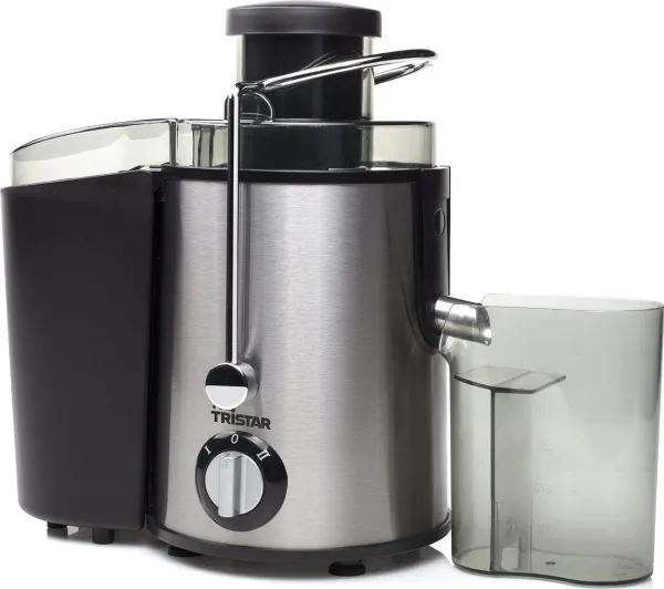 Stainless steel juicer with black finish and stainless steel filter and blades. Also provided with 2 speed settings, anti drip stop, safety switch, pulp container and sap container with spout (0.5L).\n\n- Stylish and practical juicer with a power of 400 Watt\n- By means of grating and centrifuging the ingredients, juice and pulp are separated\n- Suitable for both hard and soft fruits and vegetables thanks to two speed settings and stainless steel knives\n- Easy to clean because the juicer can be disassembled easily\n- Practical in use thanks to the non-drip system and separate juice container with a volume of 0.5 litres
