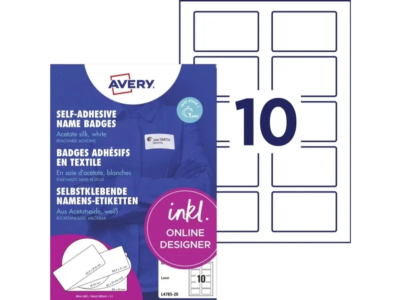 • Fjernes nemt uden at efterlade mærker • Nem, professionel og praktisk navneskiltløsning • Elegant PVC-frit silkemateriale (Acetat) • Design og print nemt med GRATIS skabeloner på www.avery.eu eller skriv i hånden med en standard kuglepen (ikke tuschpen eller penne med flydende blæk). |