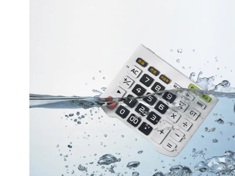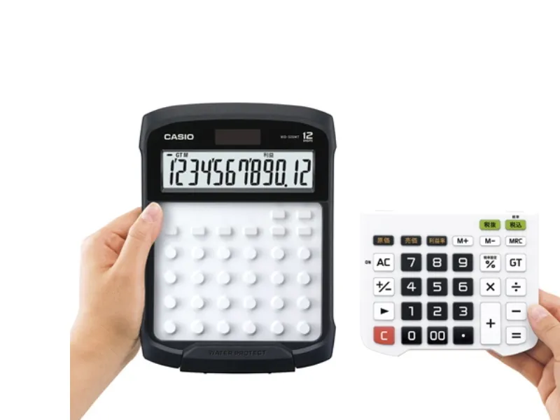 Praktisk desktop regnemaskine med 12-cifret LCD-display. Tastaturet kan fjernes og er vandtæt, således tastatur kan rengøres og er altid præsentabel og ren. Computeren selv kan rengøres med en fugtig klud. Den integrerede solpanel er tilstrækkelig til at vende lommeregner, i tilsvarende dertil lys bestråling for at holde det i gang, og dermed forlænge batteriets levetid. Ideel også for eksempel på hjemmesiden, i værkstedet eller ved arrangementer der skal anvendes ved kassen. Vand og støvtæt bordregner tastatur aftageligt og vandtæt 12-cifret LC-display