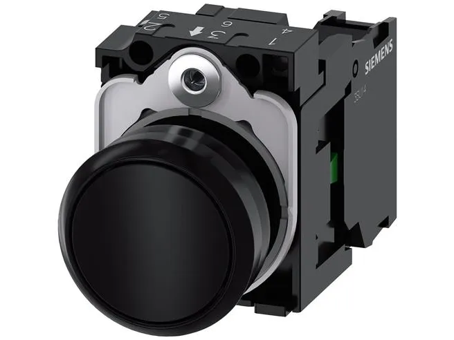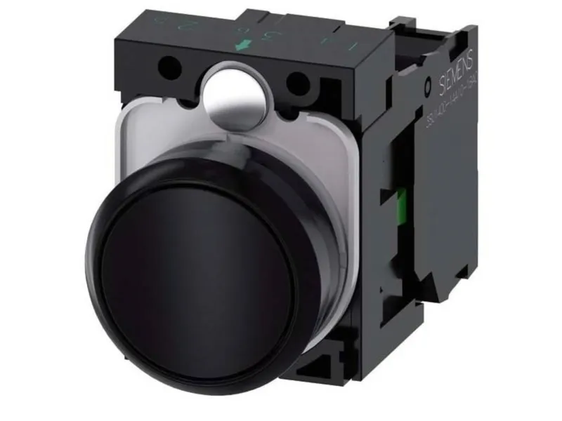 Pushbutton, 22 mm, round, plastic, black, button, 1 NO Pushbutton, 22 mm, round, plastic, black, pushbutton, flat, momentary contact type, with holder, 1 NO, screw terminal Pushbuttons SIRIUS ACT for switching and controlling electrical loads. Under the brand name SIRIUS ACT, Siemens offers a unique portfolio of pushbuttons and signaling devices with global product approvals in four modern design lines of rugged genuine metal and high-grade plastic. An innovative snap-on concept makes the task of installing a unit so easy that it can be done with one hand and without any special tools. Groove-free holes are adequate as mounting holes since full twist prevention is already integrated. Thanks to the high degree of protection throughout, the rugged devices are suitable for use in industry and outdoors. Even cleaning with a high-pressure jet is possible. Neither dust, oils, nor caustic solutions can interfere with reliable operation. As well as standard wiring, the devices can also be connected to the controller via PROFINET, AS-Interface or IO-Link. Doing so will help you to reduce wiring time and effort, minimize error sources and have more flexibility. The graphical Online Configurator provides convenient support when selecting and ordering individual devices, enclosures and labels. Extensive documentation (e.g. manual, 3D data, terminal diagram) is available. Versions available: Several colors, illuminated/non-illuminated, with/without inscription, latching/momentary contact operation, various button and front ring heights. Note: Complete unit, delivery includes holders and modules. SIRIUS ACT - Performance in action for control and signalling. Simply mounted, simply strong, simply perfect.