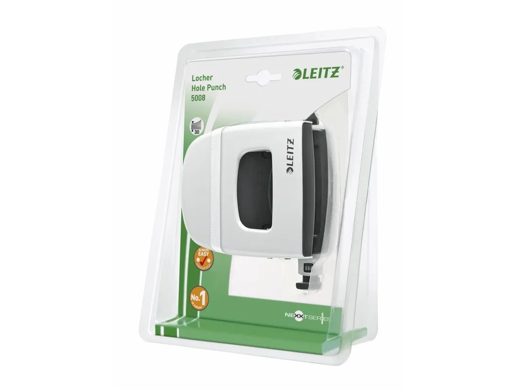Sturdy metal punch for everyday use. Robust and reliable. Patented grip zone and ultra sharp stamps reduce punching effort.\n\n- Punches up to 30 sheets of paper (80 gsm)\n- Grip zone and sharper stamps reduce punching effort\n- Clear format demarcations and strong guide bar ensure perfect paper alignment\n- Easy to empty, hinged waste box\n- 10 year guarantee and GS safety tested