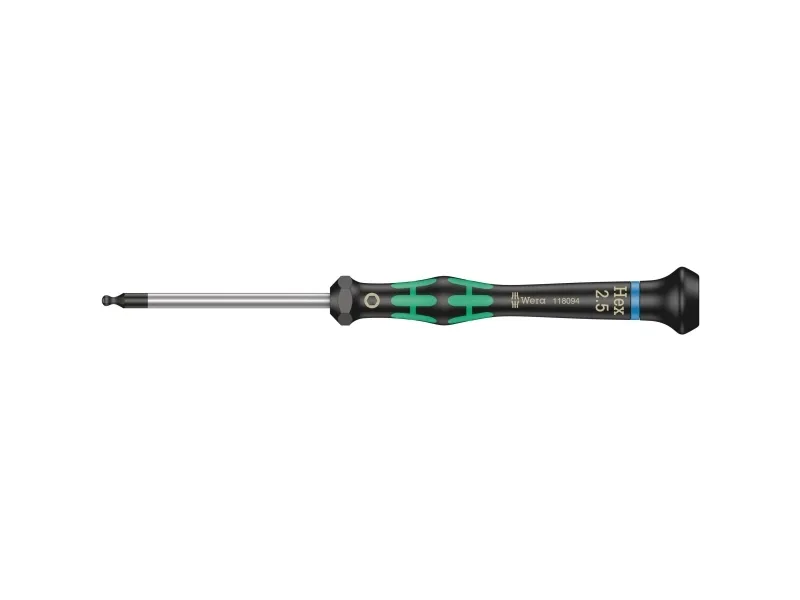 Elektronik-sekskant-kuglehoved-skruetrækker, 2,5 x 60 mm Wera Micro-skruetrækker til finmekaniske forskruninger. Med sekskantet kuglehoved på lange ben: Gennem de kugleformede afdriftsprofiler er en drejning eller svingning af værktøjsaksen til skrueakse mulig, så der kan skrues om hjørner. Ved at understøtte hånden på drejehætte og med hurtigdrejezonen under drejehætte er lynhurtigt skruearbejde muligt. Tidsintensiv drejninger bortfalder. Kraftzone med integrerede bløde zoner sørger for overførsel høje frigivelses- og tilspændingsmomenter. Præcisionszone for den rigtige drejevinkel ved justeringsarbejde. Wera Black Point-spids giver nøjagtighed og optimeret korrosionsbeskyttelse. Black point-spids Kraftform Micro med afrulningsbeskyttelse Drev: SW svarer til DIN 911; Black Point.