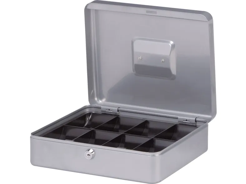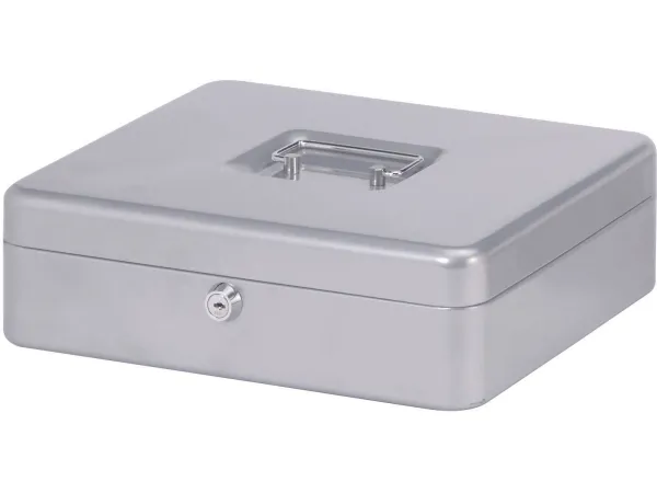 Pengekasse, 30 cm Lavet af lakeret stål, helpresset, galvaniseret greb. Sikkerhedscylinderlås med 2 nøgler. Møntindsats af plastik.