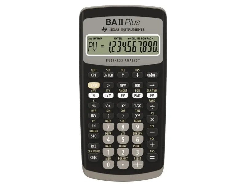 BA II Plus. Ideel regnemaskine til statistikere, ledere og finanseksperter. Beregning af TVM (Time-Value-Money), annuiteter, terminer, leasing/lejem�l, opsparinger med mere. Genererer amortisationsplaner. Udf�rer pengestr�msanalyser for op til 24 forskellige pengestr�mme med op til 4-cifrede hyppigheder, beregner NPV og IRR. Statistik med 1 eller 2 variable med 4 regressionsindstillinger: Line�r, Logaritmisk, eksponentiel og potens. 4 forskellige metoder til beregning af afskrivning, bogf�rt v�rdig og restv�rdig. Beregner ogs�: Balancepunkt, rentekonverteringer, delta%, avance og tab. De matematiske funktioner omfatter trigonometriske beregninger, naturlige logaritmer og potenser. Slagfast beskyttelsesetui. Batteridrevet. APD (Automatic Power Down) forl�nger batteriets levetid.