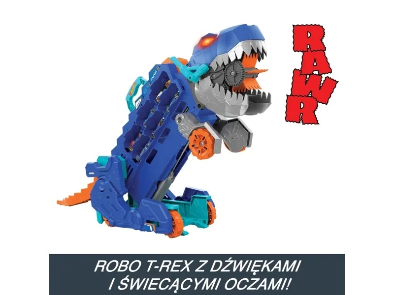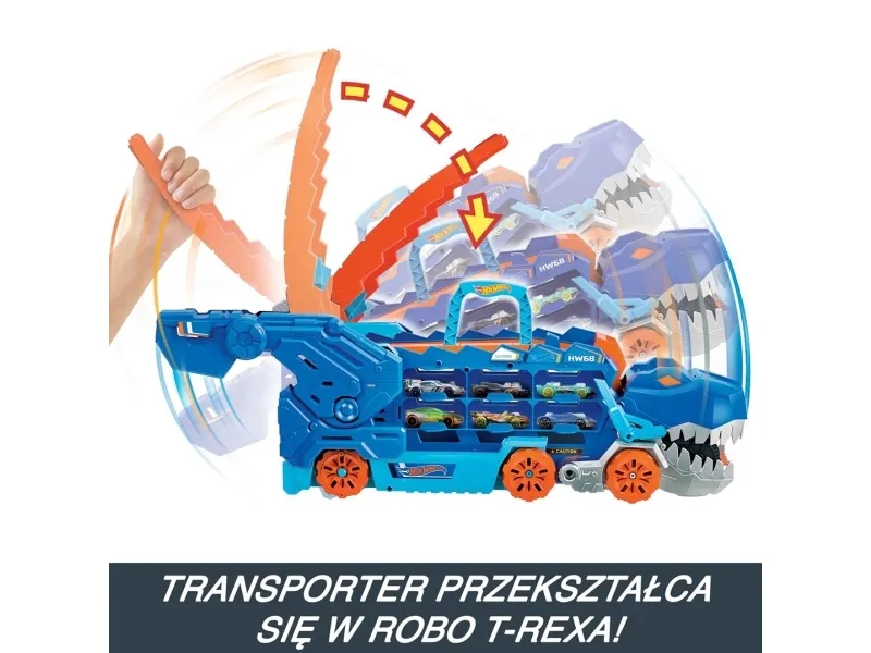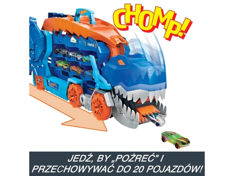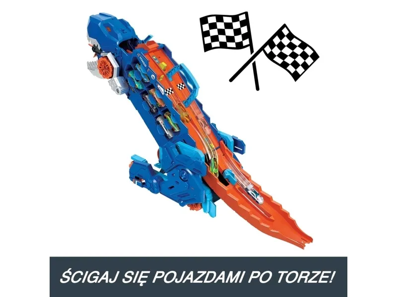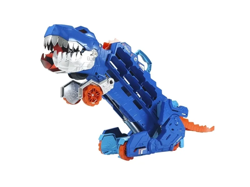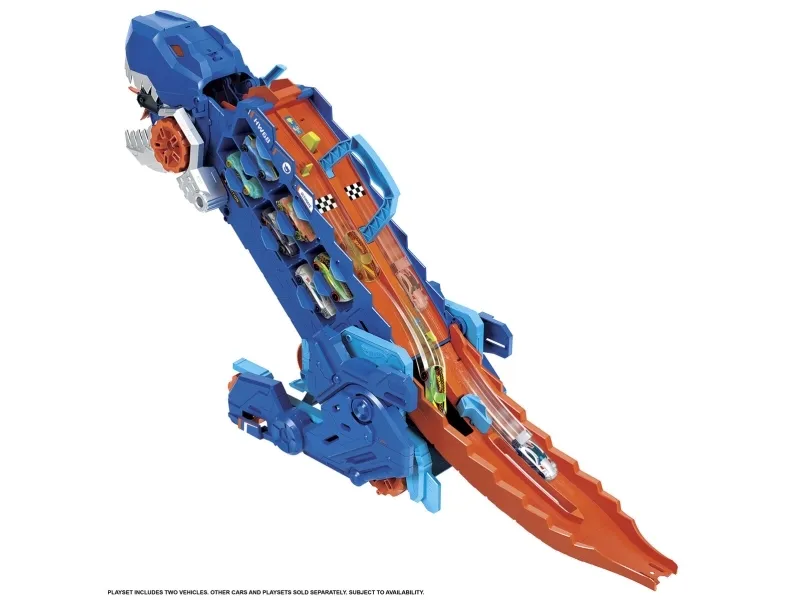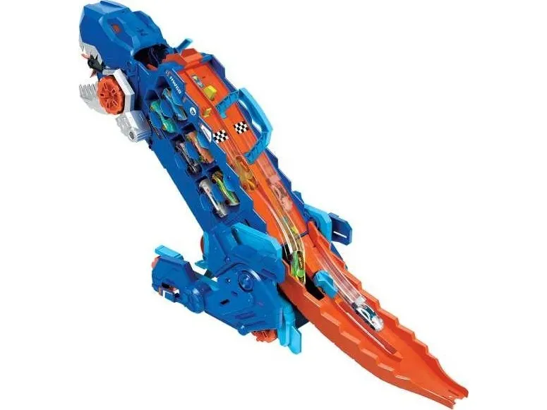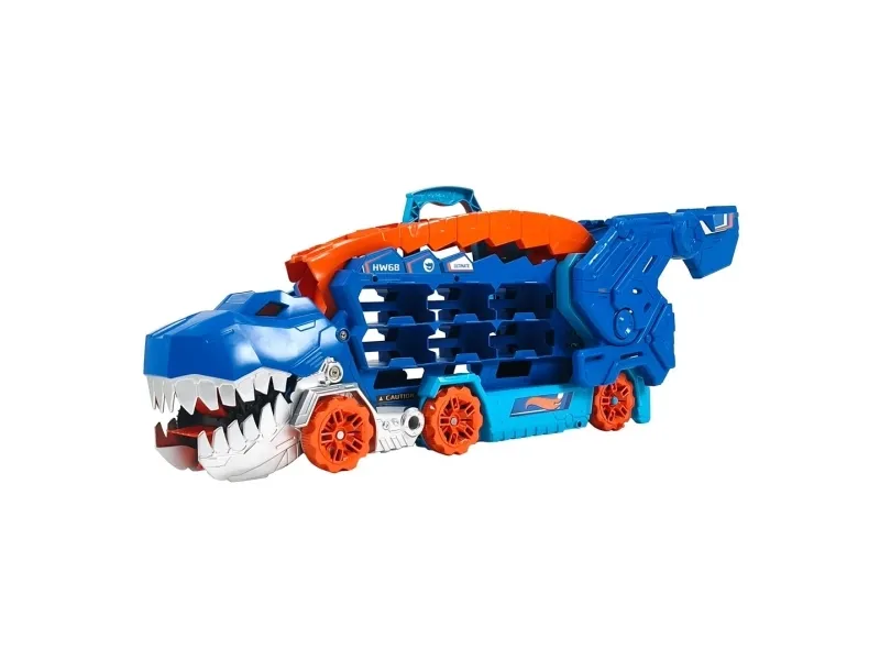 The Hot Wheels City Ultimate Hauler can gobble up and haul more than 20 1:64 scale cars and then transform into a growling, stomping T-Rex with a race track on its back! In hauler mode, pull it by the handle and watch it eat the 1:64 scale cars in its path. Lower the tail and it transforms into a Robo T-Rex with lights and sounds and a two-lane race track. Kids will recognize it from the Netflix series 'Let's Race' and can recreate their favourite scenes or invent new ones! Two 1:64 scale Hot Wheels cars are included. Colours and decorations may vary.Hot Wheels City Ultimate T-Rex Transporter, Hauler Transforms into a Dino, Featured in “Let’s Race”. Product type: Vehicle & track set, Recommended age (min): 4 yr(s), Recommended age (max): 5 yr(s). Battery type: AAA, Number of batteries supported: 3. Material: Plastic, Product colour: Multicolour