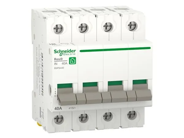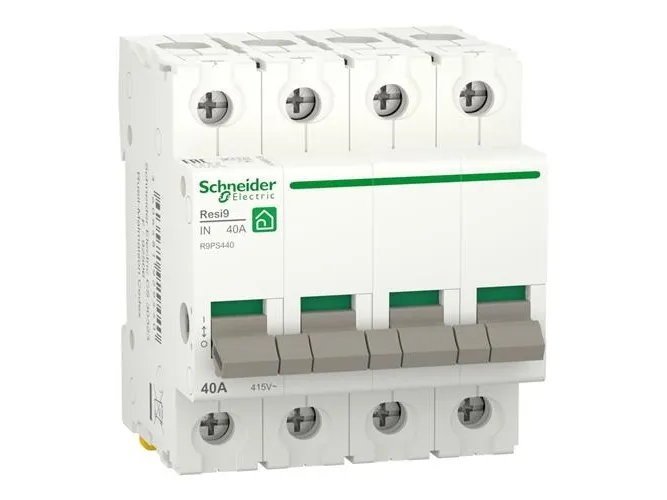 Dette Resi9 produkt er en afbryder/hovedafbryder. Det er en 4-polet afbryder med 40A mærkestrøm ved 415VAC Denne afbryder bruges til styring (åbning og lukning af kredsløb under belastning). Dette produkt bruges også til afbrydelse af on-load elektriske kredsløb, der allerede er beskyttet mod overbelastning og kortslutninger. Elektrisk udholdenhed går op til 10.000 cyklusser. Mekanisk udholdenhed går op til 50.000 cyklusser. Ui nominelle isolationsspænding er 500 VAC. Den har en Uimp-mærket impulsmodstandsspænding på 6kV. Driftsfrekvensen er 50Hz eller 60Hz. Den kan monteres på en DIN-skinne til modulopbygning. Dens bredde er 8 pitch på 9 mm. Målene er (B) 72mm x (H) 81mm x (D) 70,5mm Produktets vægt er 309g. Farven er hvid (RAL9003). I henhold til IEC 60529-standarden er beskyttelsesgraden IP20 eller IP40 i modulær tavle. Driftstemperaturen er -25°C til 60°C. Opbevaringstemperaturen er -40°C til 85°C. Dette produkt overholder EN/IEC 60669-2-4 standarden.