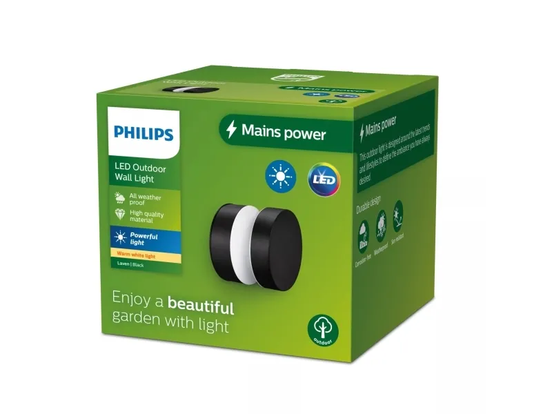 Philips Laven Wall Light 6W. Type: Outdoor wall lighting, Product colour: Black, Housing material: Stainless steel. Number of bulbs: 1 bulb(s), Bulb type: LED, Light colour: Warm white. Power source type: AC, Input voltage: 220-240 V, Energy efficiency class: E. Width: 100 mm, Depth: 100 mm, Length: 100 mm. Quantity per pack: 1 pc(s), Package width: 110 mm, Package depth: 110 mm