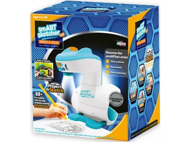 smART sketcher 2.0 tager alt det du elskede ved den prisvindende smART sketcher projector og kommer nu i en ny og forbedret udgave med forbedret hardware, nyt indhold, mere holdbare filmruller, en mere robust base og en indbygget filmrulleholder. Dette enestående STEAM læringslegetøj gør det sjovere at tegne og skrive for børn med trin- for- trin skitsering og læseplansbaseret læringsaktiviteter. Børn har mulighed for at fordybe sig i mere end 60 forskellige alders- og klassetrins aktiviteter som tilskynder fin motoriske og kreative færdigheder. En gratis smART sketcher 2.0 app er tilgængelig og skaber uendelige muligheder ved at lade børn tage et foto, projicere det på papir og begynde at tegne som en professionel. Yderligere filmruller, herunder staveaktiviteter med undervisning, kursiv skrivning, sprogundervisning og tematiseret tegninger plus blyanter, farveblyanter, tudser, rammer og professionelle kunstværktøjer medfølger ikke.