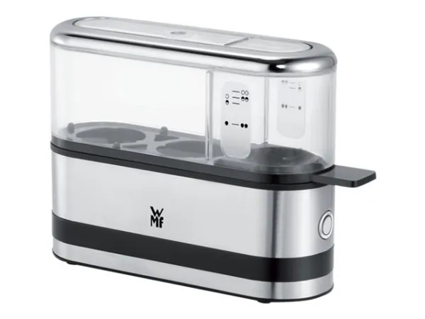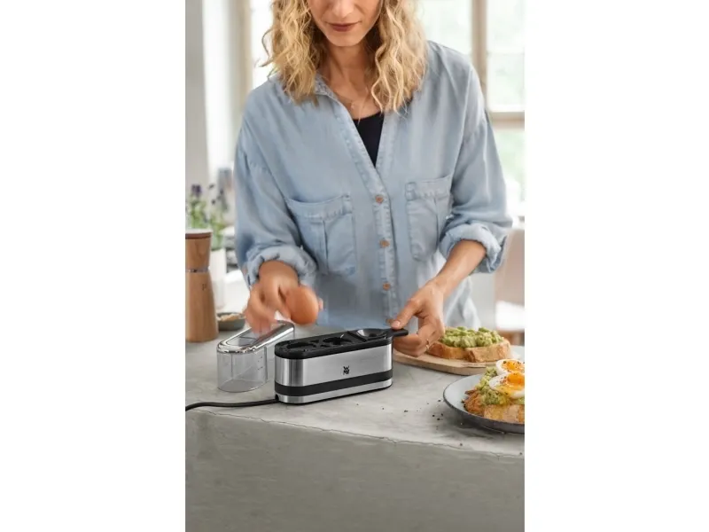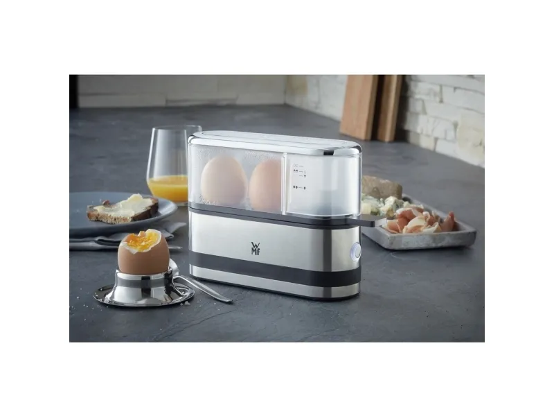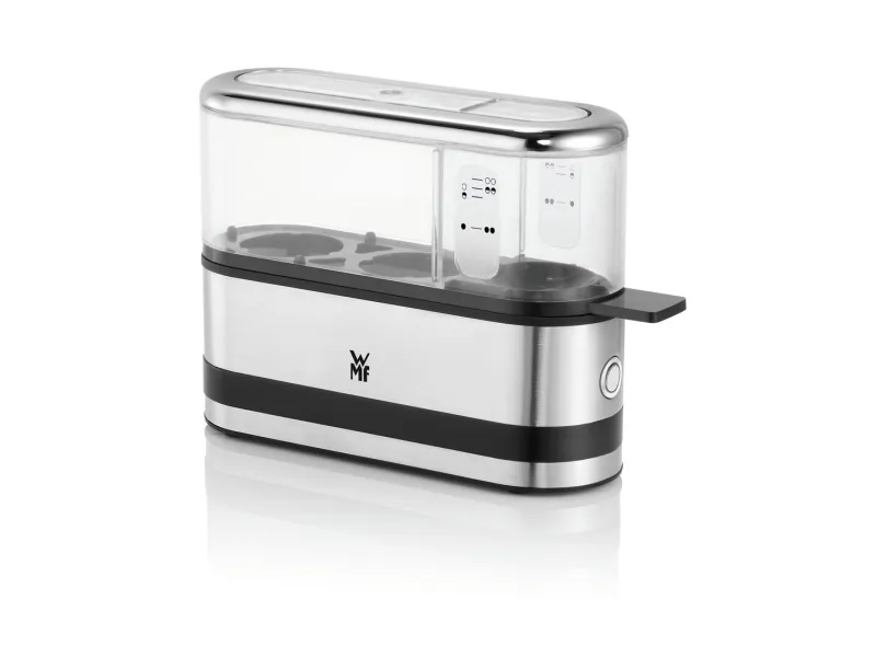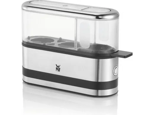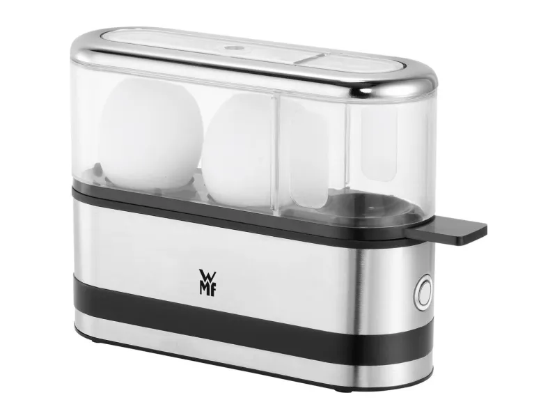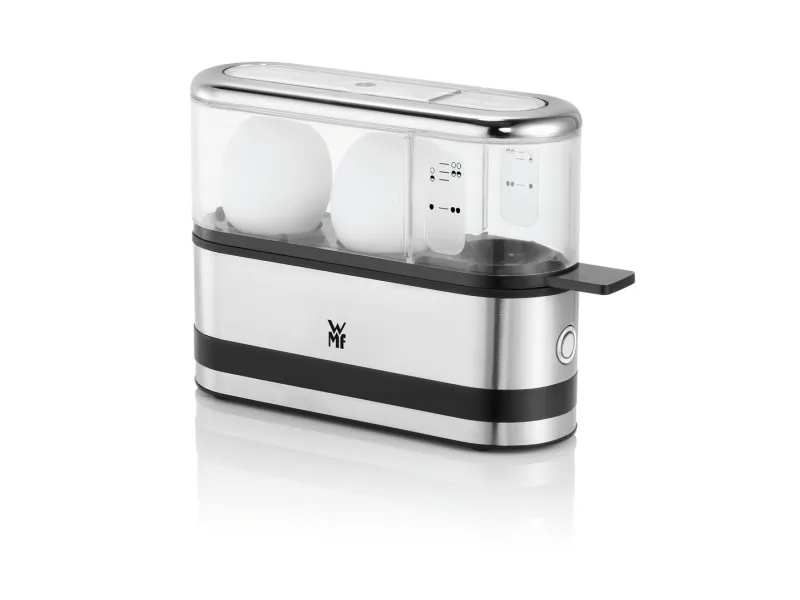 The mini egg boiler saves space and cooks one or two breakfast eggs. The transparent cover made of high quality Tritan is BPA free, stable and easy to clean. The water quantity can be measured out according to the egg size and the required hardness. As soon as the eggs are ready an acoustic signal sounds.
