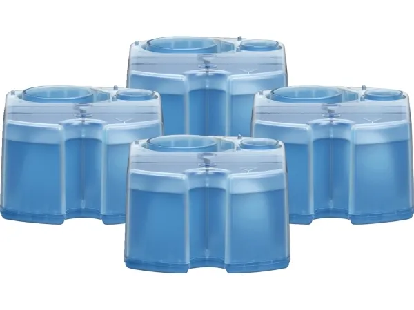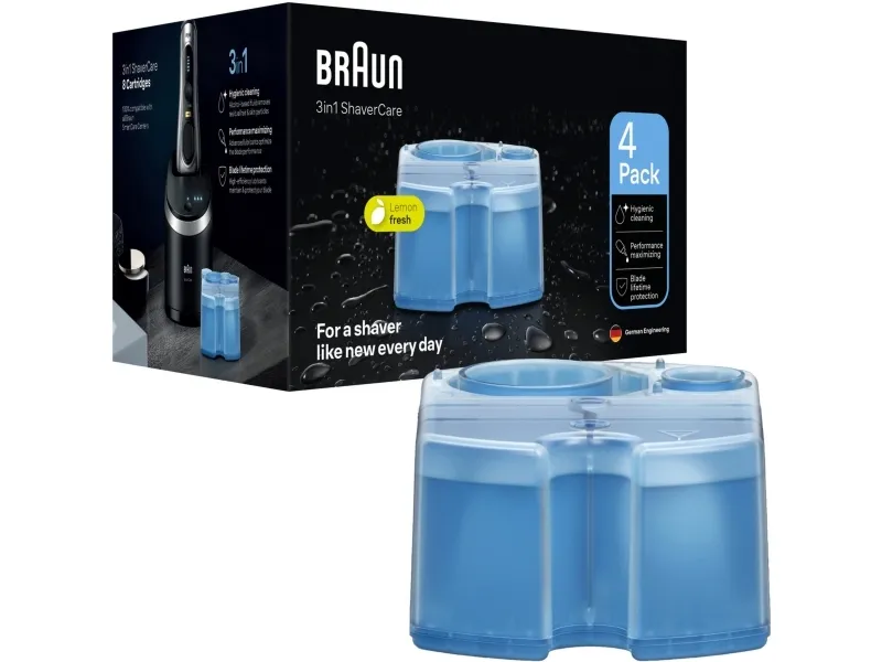 Braun Clean & Renew cartridges will keep your electric shaver feeling like new. The alcohol-based solution cleans more hygienically than water, removing residual hair and skin particles that cumulate after every shave. High energy lubricants maintain your shaver's blades and help reduce friction, which may cause skin irritation. The lemon-fresh formula releases a refreshing scent, giving you an invigorating shave every time. The Braun Clean & Renew cartrigdes are compatible with any SmartCare Center unit.Braun CCR4. Product type: Cleaning cartridge, Product colour: Blue, Brand compatibility: Braun. Package type: Box. Quantity per pack: 4 pc(s)