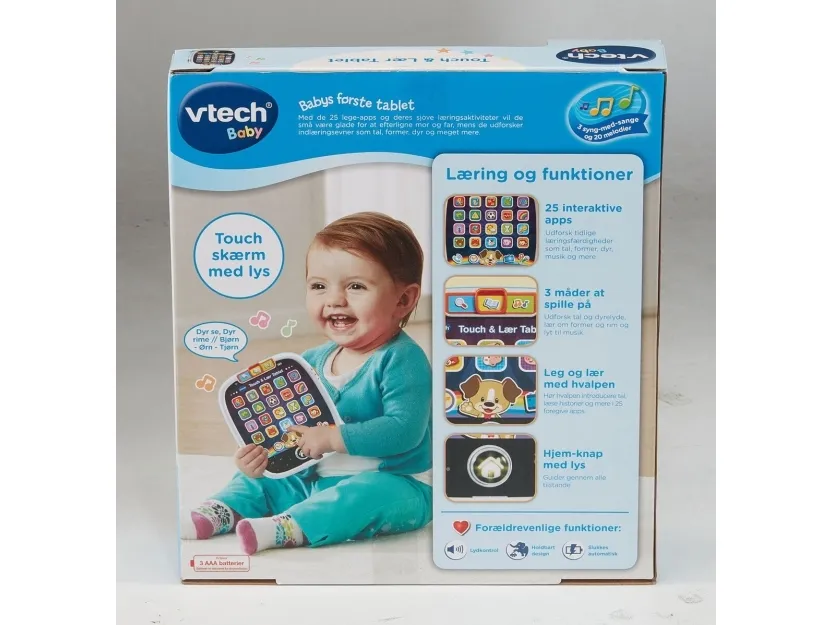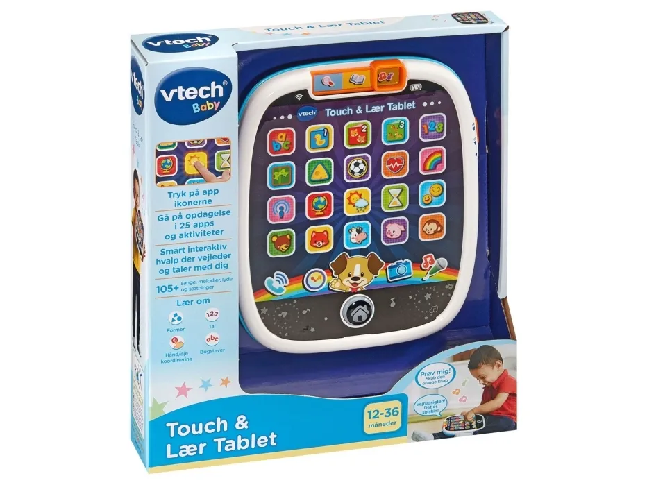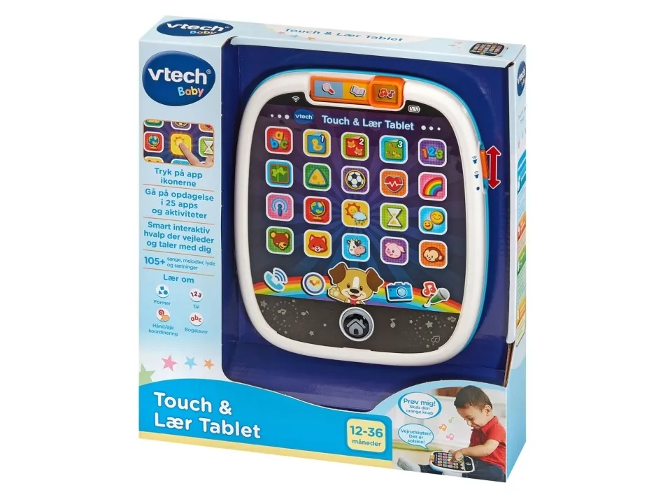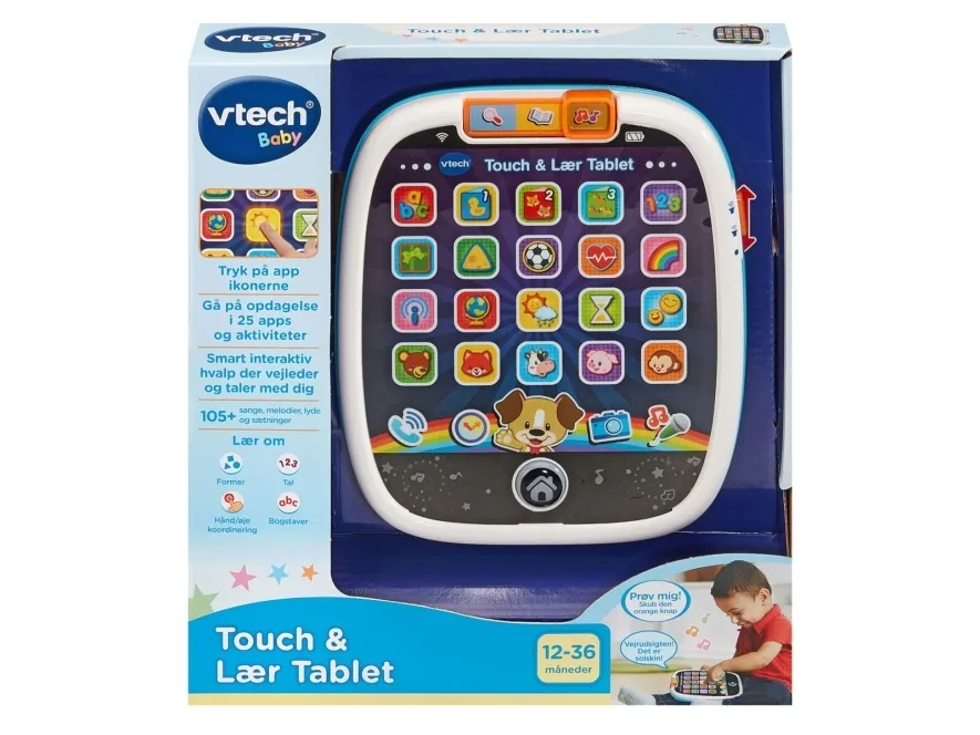 Your little one will have a tablet of their very own with the Touch & Teach Tablet by VTech!. When they tap the 25 pretend light up app buttons to explore, discover and learn early skills including numbers, shapes, animals, colours, letters and much more. Little ones can also take virtual pictures, make pretend phone calls and check the time! Features 3 modes of play; Explore, Music and Learn. Light up glowing home button and swiping along the buttons triggers fun light patterns. Includes 3 sing along songs and 20 melodies. this fun-packed toy will keep little ones engrossed for hours.
