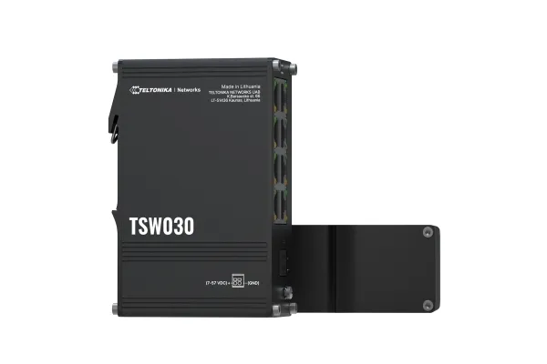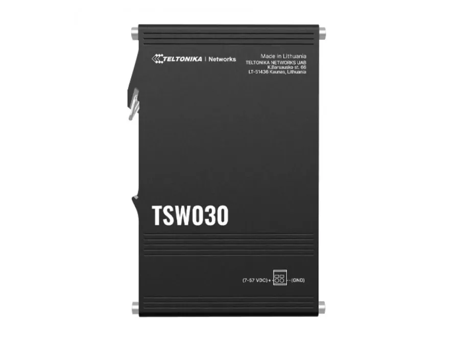 The Teltonika TSW030 is a reliable and efficient switch with a robust build that ensures optimal performance in various environmental conditions. With an operating temperature range of -40°C to 75°C and a humidity range of 5 - 95%, this product is suitable for both industrial and outdoor applications. The device features eight 10/100 Base-T ports and supports auto-uplink functionality, which simplifies connections and enhances network efficiency. Designed with user convenience in mind, the TSW030 boasts a packet buffer size of 128 KB and a non-blocking bandwidth of 20 Gbps, making it capable of handling high data loads without compromise. Its metal housing provides durability while maintaining compliance with various standards, such as IEEE 802.3u and IP30. The compact DIN rail mountable form factor ensures easy installation in diverse settings, making it a solid choice for any network setup.