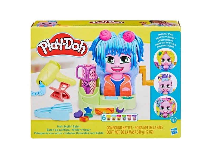 Kids can express their unique style with the Play-Doh Hair Stylin' Salon playset! Just load in some Play-Doh compound and start growing and styling silly Play-Doh hair! This Play-Doh kit includes lots of fun Play-Doh accessories like a curl-creating hair dryer, mohawk mold, crimper, and 2 different plates to make different hair textures. And with 12 ounces (340 g) of Play-Doh compound, including 3 dual-color cans, kids can make long or short styles! This indoor playset is perfect for imaginative play. Play-Doh sets for girls and boys make great gifts for 3 year olds and up.Play-Doh Hair Stylin' Salon Playset. Product type: Children's craft kit, Recommended age (min): 3 yr(s), Product colour: Multicolour. Package type: Closed box