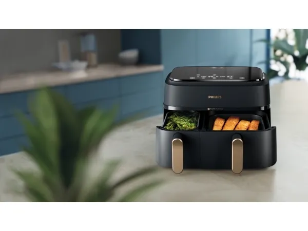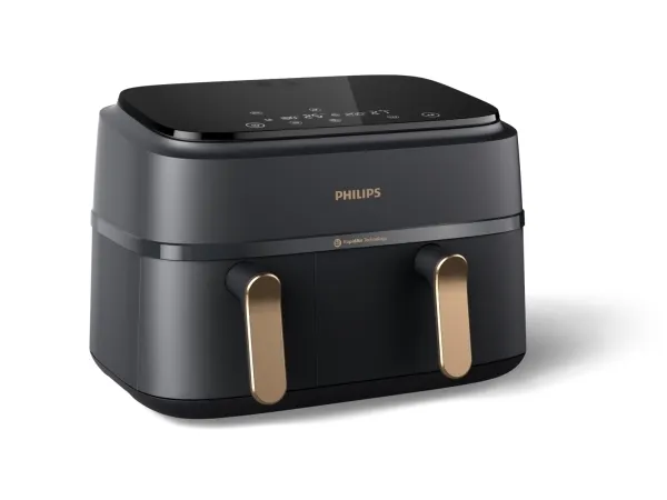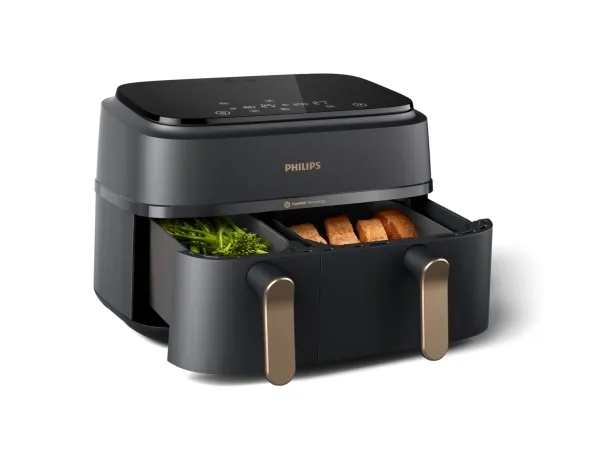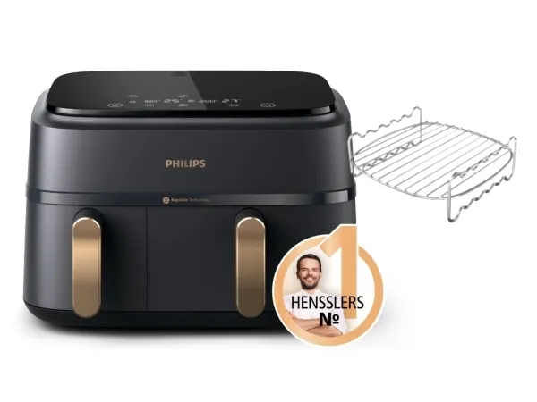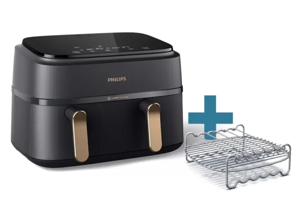 Experience efficient cooking with the Philips Series 3000 double hot air fryer, designed to make meal preparation easier and healthier. With a generous 9-liter capacity and innovative Rapid Air Plus technology, this appliance allows for quick and even cooking without the need for excess oil. The digital display and touch-sensitive controls provide an easy and intuitive cooking experience, while the included rack enhances versatility for all types of dishes. Safety features such as cool touch housing and cold handles ensure safe operation, making it suitable for various settings. The non-stick coating in the two removable baskets simplifies the cleaning process, which is further aided by the dishwasher-safe basket. With adjustable settings, including a keep warm function and timer, this fryer can reach a maximum temperature of 200 °C, allowing for a variety of cooking options.