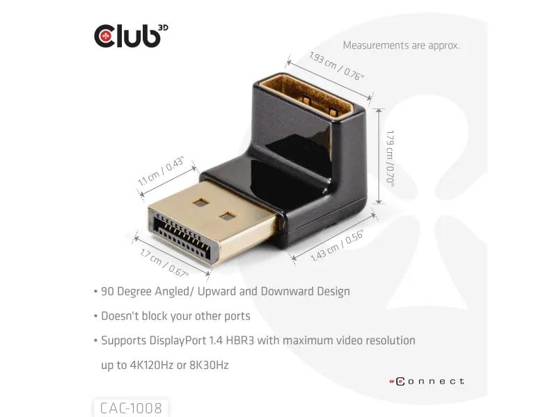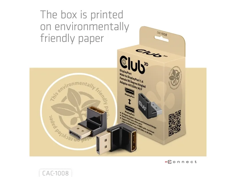 DISPLAYPORT HAN TO DISPLAYPORT 1.4 HUN 90 graders vinkel/ op- og nedvinklet Enkel tilslutning af dit kabel Blokerer ikke dine andre tilslutninger Understøtter DisplayPort 1.4 HBR3 med en maksimal videoopløsning på op til 4K120Hz eller 8K30Hz Understøtter DisplayPort 1.4 og bagudkompatibel med ældre versioner Overførselshastighed 16.2 Gbps /2.7 Gbps / 5,4Gbps / 8.1 Gbps Minimalt signaltab Club 3D CAC-1008 DisplayPort han to DisplayPort 1.4 hun med 90 grader afviklede adapter 4K120Hz M/F er en alsidig vinkelstik-adapter, der giver løsninger til kabelhåndtering. Med denne adapter kan du undgå blokering af andre tilslutninger på din host-enhed. Også til skærme med en tæt placering af DisplayPort-indgangen kan dette være en enkel løsning, når der ikke blokeres eller bøjes andre tilslutninger. Dette sæt indeholder 1 adapter og kan anvendes universelt til displayopløsninger på op til 4096*2160 ved 120 Hz eller 7680*4320 ved 30 Hz. Adapterne er verificeret og understøtter disse opløsninger med Club 3D-produkter. Det er vigtigt, at kilden og skærmen DP1.4 understøtter, og at kablerne også er designet til denne båndbredde.