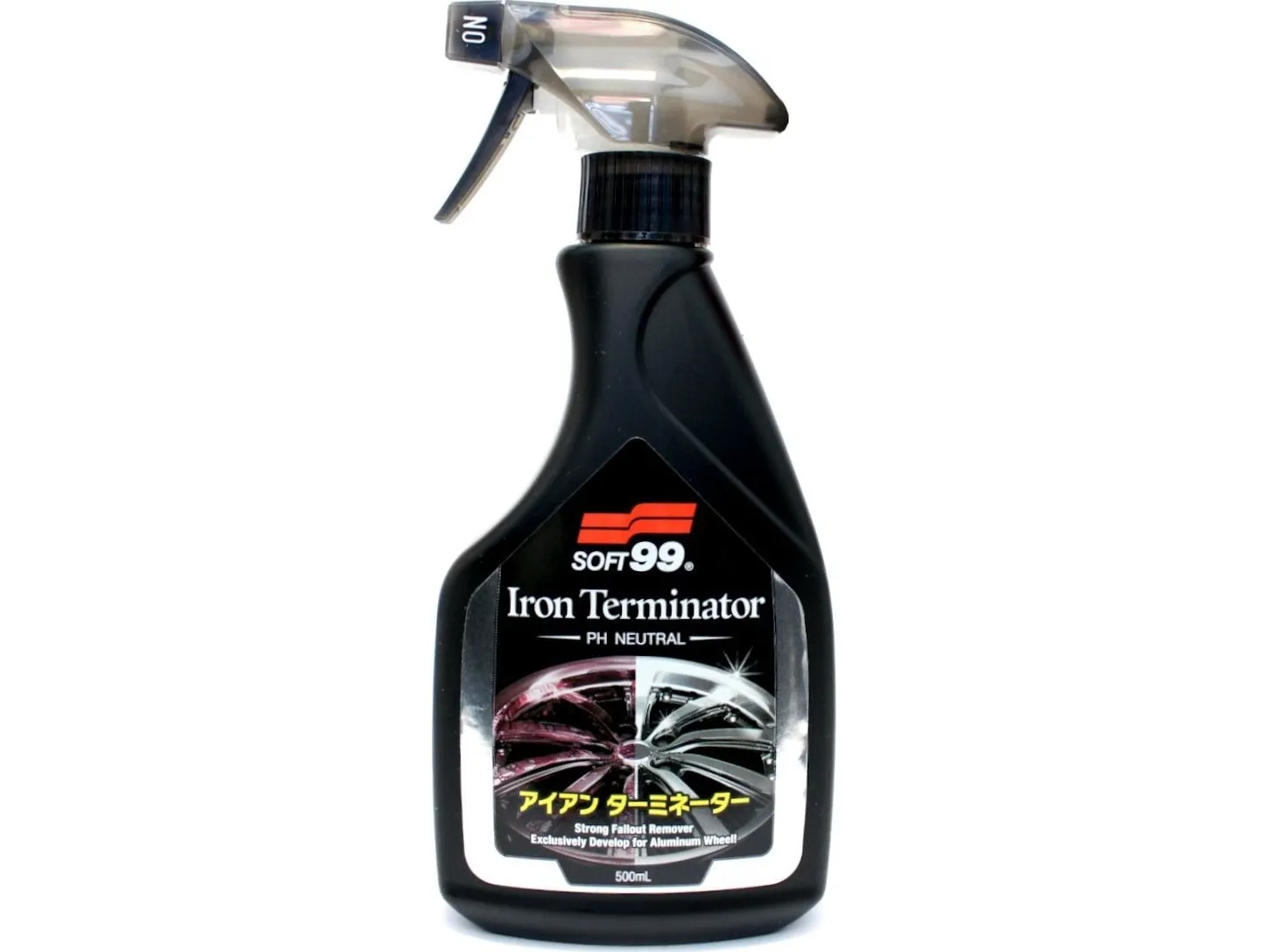 Iron Terminator – den ultimative fælgrens og flyverustfjernerVed ganske almindelig kørsel på de danske veje og som følge af nedfald fra skorstene m.m., udsættes bilens lak for en ”regn” af metalstøv og metalsplinter. Ikke mindst bilens fælge er meget udsatte, da de jo ”pisker” rundt tæt ved vejbanen, hvor en stor mængde skidt ligger. Ikke mindst afgives også en hel del fint metalstøv fra bilens bremser. Skidtet sætter sig på overfladen, som det man populært betegner som ”flyverust”. Ved første øjekast kan det være svært at se, men kommer du tæt på lakken, så er du ikke længere i tvivl. De mange små metalpartikler ødelægger lakken, og de bør derfor fjernes.Iron Terminator fra Soft99, klarer let en stor del af den opgave. Sprøjt på, og lad virke. Når Iron Terminator arbejder på overfladen, vil væsken skifte til en kraftig mørkerød farve. Det viser metalskidtet, der opløses og frigøres.Grundet den PH-balancerede sammensætning er væsken sikker at bruge på mange forskellige overflader. Herunder lakerede overflader, aluminium og polerede overflader m.m.Indhold: 500 ml.
