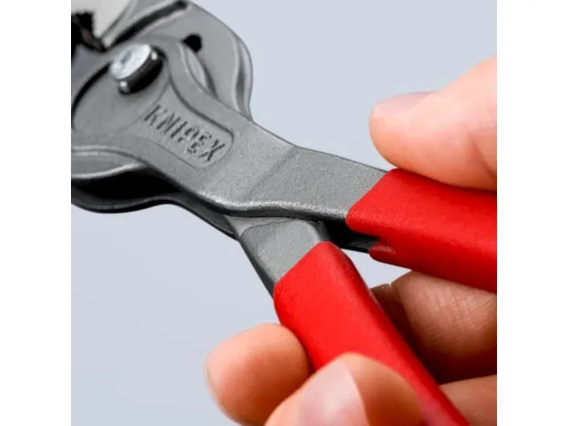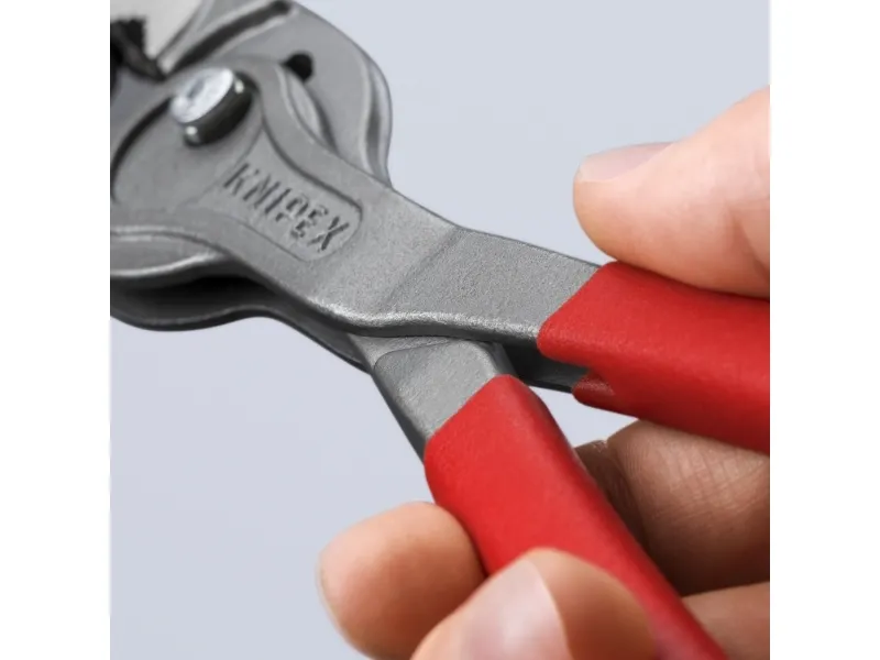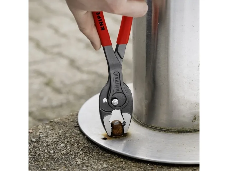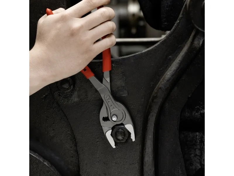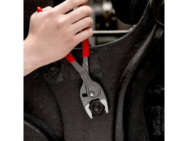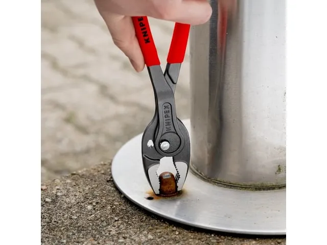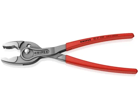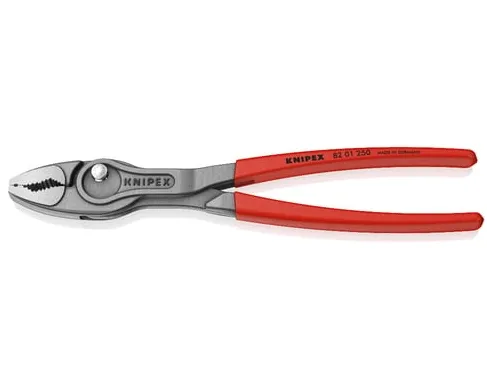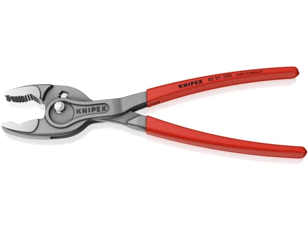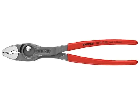82 01 250 KNIPEX TwinGrip® Gribe, spænde og løsne skruer med ødelagte hoveder og gevind. Unik kombination: Med front- og sidegribefunktion, gennemstukket led, trykknapjustering. Effektiv frontgribekæbe med robust fortanding og høj udveksling ved værktøjsspidsen. Meget slank og kompakt tang: fintfølende arbejde selv under trange pladsforhold, med slank drejezone til hurtig skruning. Pålideligt, frontalt greb af flade emner op til 10 mm med trepunkt-system. Syvvejs justerbart glideled med trykknapjustering til præcis justering af gribebredden. Knibebeskyttelse minimerer risikoen for at klemme fingrene. Holdbar og modstandsdygtig takket være et robust, fastgjort tangled,. Griber kraftfuldt selv store, meget stramme og dybtliggende komponenter med SW 5 - 27 mm. Pålideligt, frontalt greb af flade emner op til 10 mm med trepunkt-system. Syvvejs justerbart glideled med trykknapjustering til præcis justering af gribebredden.
