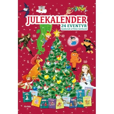 Indeholder 24 bøger, en for hver dag i december frem til juleaften. Hver bog er på 16 sider og indeholder et eventyr – læs bl.a. Hans og bønnestagen, Snedronningen og Rødhætte. Og glæd jer til de tre eventyr med et tvist, og læs, hvordan Askepot bliver til Askefant. Eventyrene er genfortalt af Peter Gotthardt.