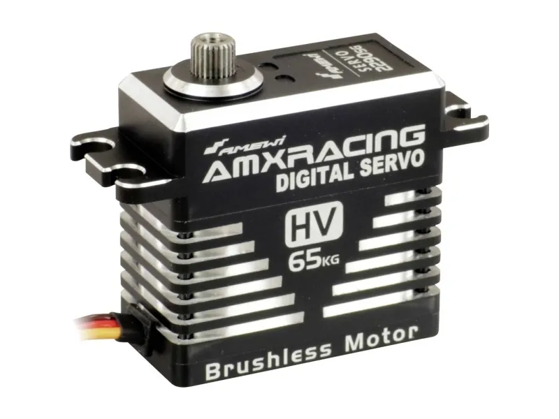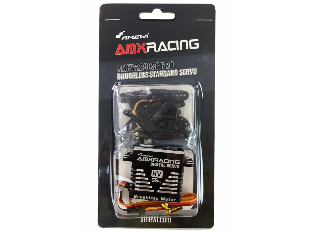 AMXRacing AMHV2290SG PRO Brushless Standard Servo Hurtig, kraftig og præcis Brushless HV servo af den nyeste generation med stålgear i standardstørrelsen 40 mm og utrolige 65 kg drivkraft på 8,4 V. Den perfekte servo til basher, scale-helikopter og fly, hvor det kommer an på stell- og holdekræfter i forbindelse med robusthed og lang levetid.