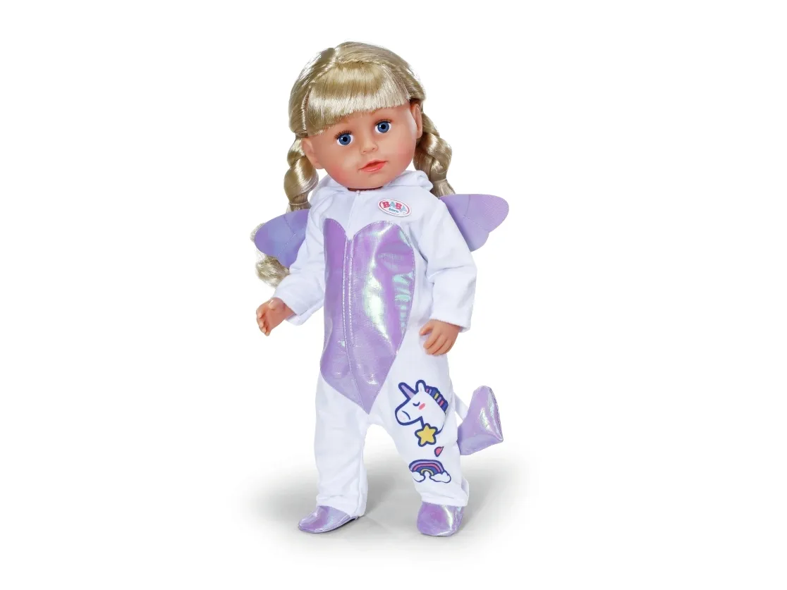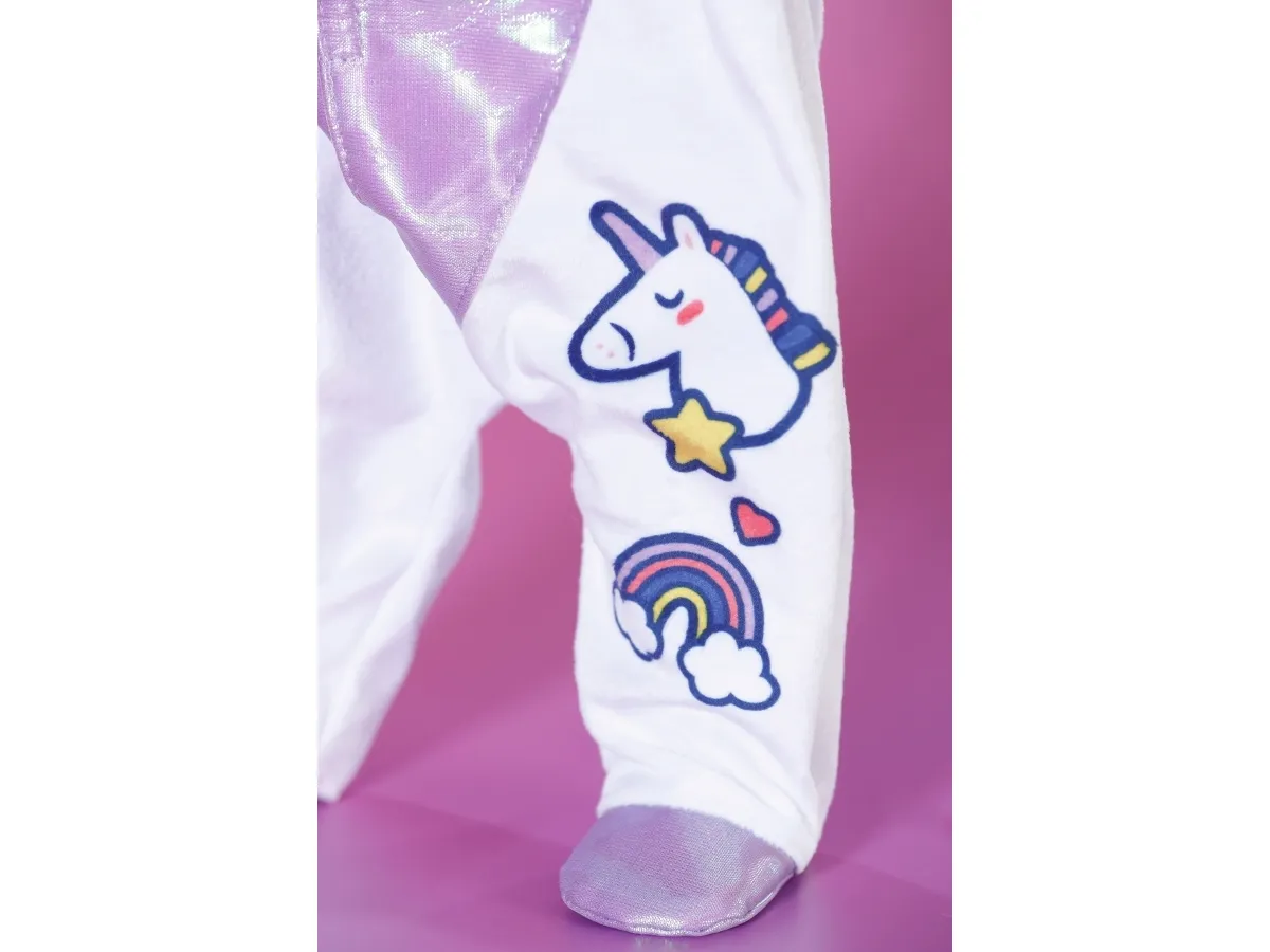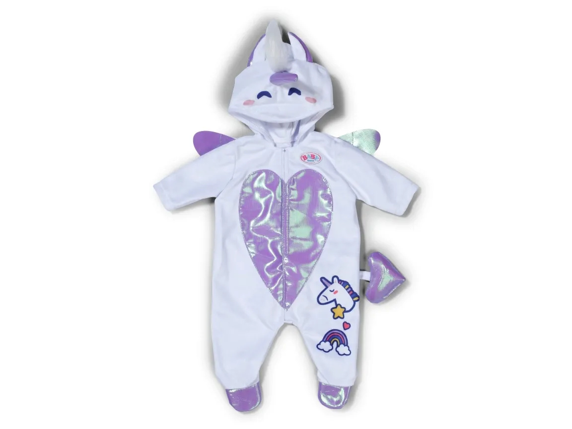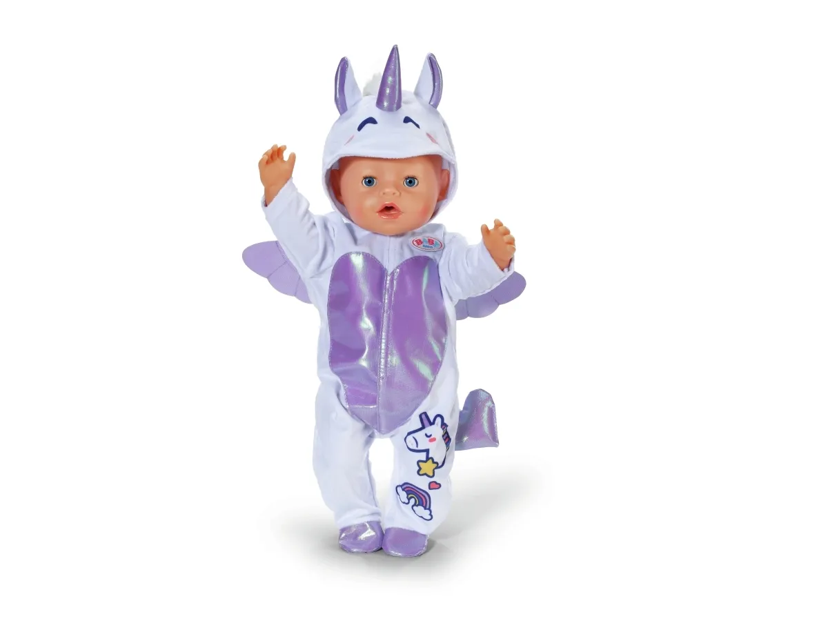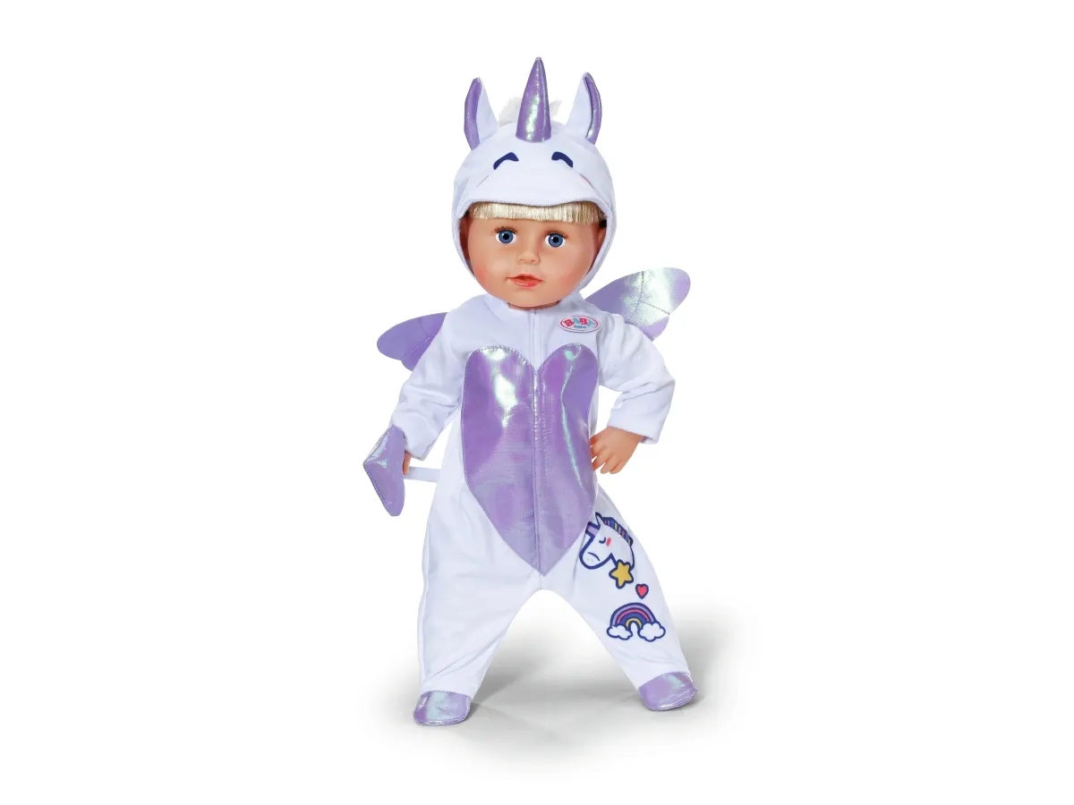 Denne fortryllende enhjørningedragt gør dukketeater eventyragtigt. Den bløde hvide dragt har hætte, som repræsenterer et enhjørningeansigt, med søde ører, et glitrende horn og fine broderier. Funklende detaljer og regnbuefarver fuldender designet og giver outfittet en snert af magi. Tilbehør af høj kvalitet til BABY born. Giver mulighed for endnu mere afvekslende og langvarig, sjov leg. Fra 3 år. Inkluderer: - BABY born enhjørningeheldragt 43 cm
