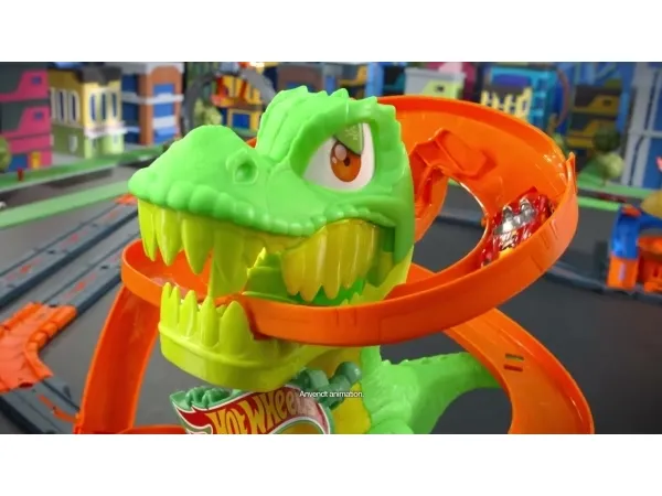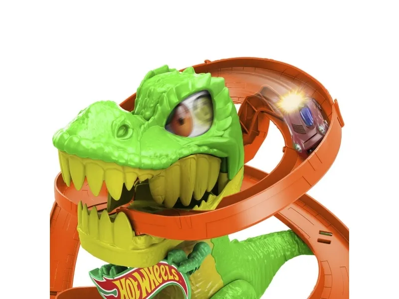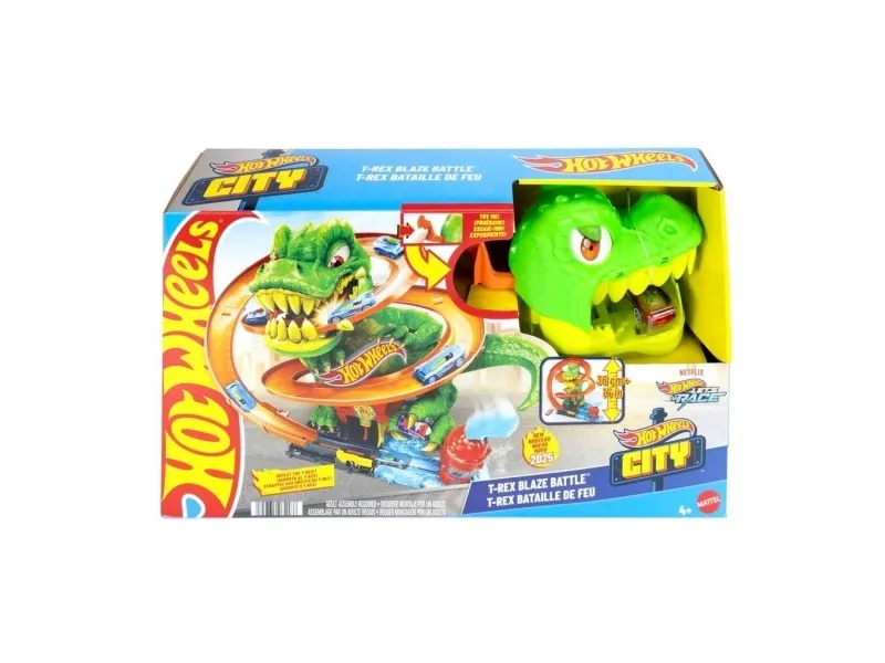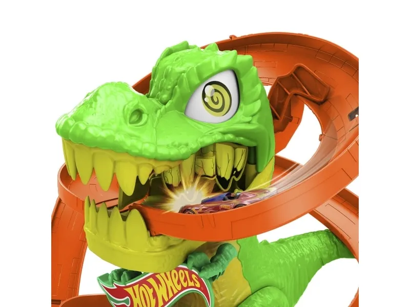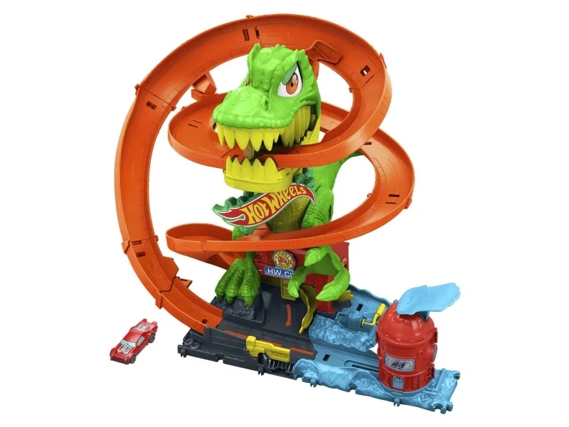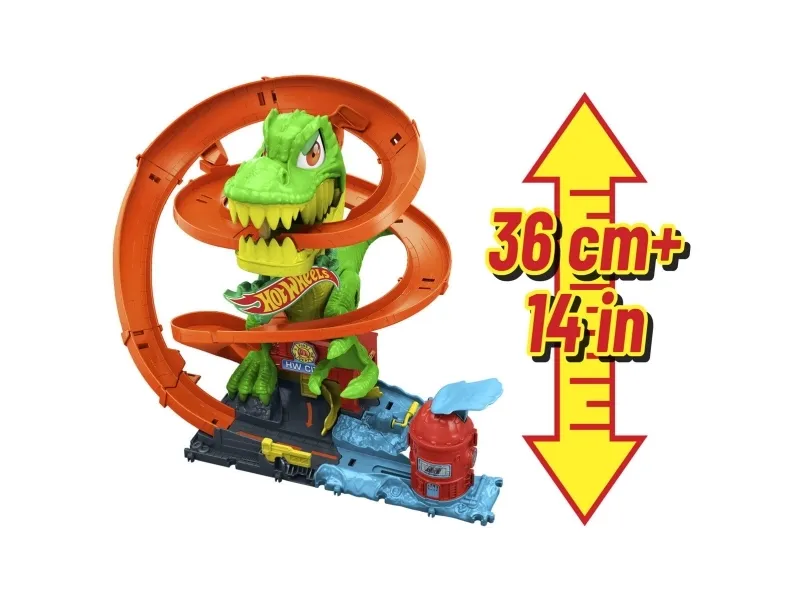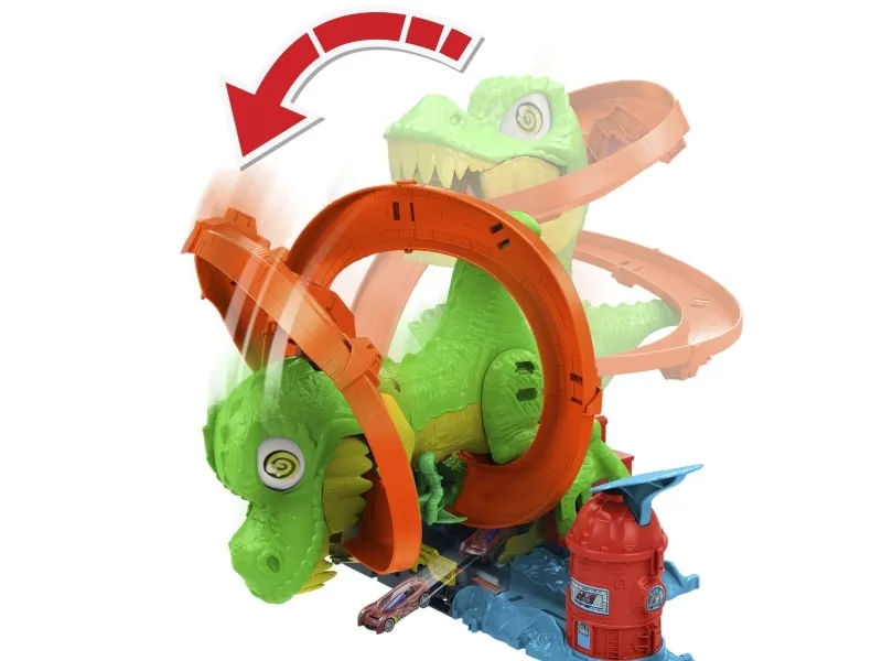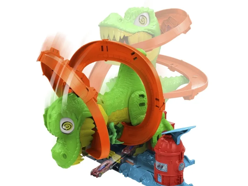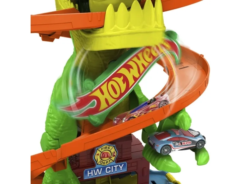 Use epic racing skills to protect Hot Wheels City from a dynamic T-Rex that wants to eat all the cars! Kids launch the included 1:64 scale die-cast toy firetruck, and it zooms around the dino with three possible outcomes: get eaten and pooped out; hit a detour to refuel; or conquer the beast and save friends. Each time cars zoom past, the T-Rex's eyes spin and arms shake until it finally collapses! There's storage for additional cars and push-around play details for open-ended storytelling. Colors and decorations may vary.