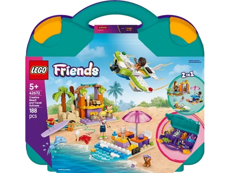 Dette 2-i-1-byggelegetøj tager børn med på en kreativ rejse, når de bygger og ombygger forskellige strandscener. LEGO® Friends legetøjssættet Kreativ strand- og rejsekuffert (42672) er en fantastisk gave til piger og drenge fra 5 år. Børn kan bygge de 3 modeller og ombygge dem til en alternativ scene, eller de kan bruge elementerne til at skabe deres egne fantasifulde kreationer. Legesættet indeholder alt, hvad børn skal bruge for at bygge en vandflyver med drejelig propel, et afslapningsområde med et surfbræt og en strandcafé med sandslotte, siddepladser og is-tilbehør. Modellerne kan ombygges til en speedbåd, et udendørs siddeområde og et pizzeria med pizzaovn. Byggesættet indeholder 2 minidukker og en hundefigur og en delfinfigur til rolleleg. Når modellerne er blevet bygget og ombygget, kan alle delene pakkes ned i kufferten, så de er klar til det næste eventyr. Byg-selv-sættet indeholder et klistermærkeark, så børn kan have det sjovt med at udsmykke kufferten.