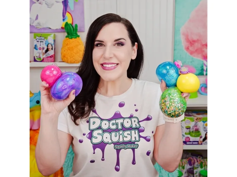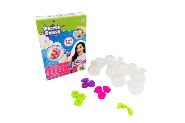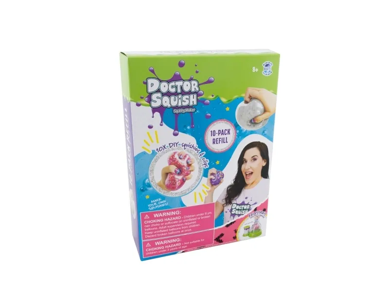 Doctor Squish elsker at finde det bedste squishy legetøj og se, hvad der er indeni! Hun kan godt lide at lave sine egne squishies og alt, der kan klemmes på. Med Squishy maskinen kan du nu også lave dine egne squishies. Brug af denne refillpakke kræver en Squishy Maker maskine. Fra 8 år. Inkluderer: - 5 gennemsigtige balloner - 5 klips