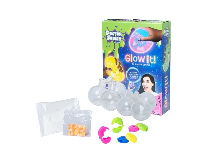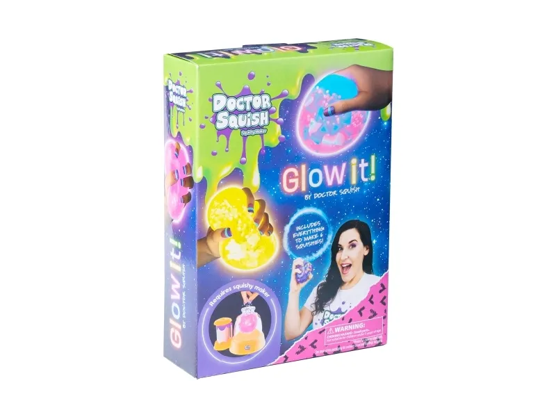 Doctor Squish elsker at finde det bedste squishy legetøj og se, hvad der er indeni! Hun kan godt lide at lave sine egne squishies og alt, der kan klemmes på. Med Squishy Neon Maker maskinen kan du nu også lave dine egne squishies, som lyser i mørke. Brug af denne refillpakke kræver en Squishy Neon Maker maskine. Fra 8 år. Inkluderer: - 6 gennemsigtige balloner - 6 genanvendelige farvede klips - selvlysende dekoration - selvlysende slimpulver