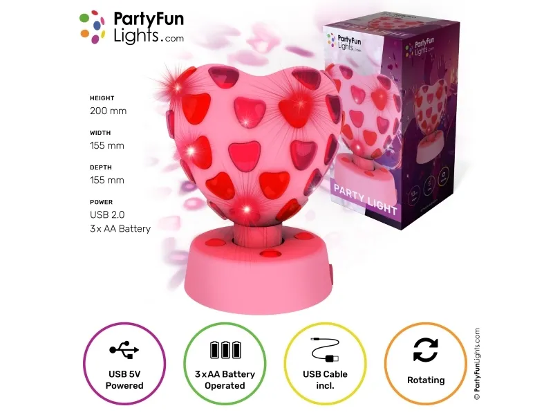 Hvis du vil udtrykke din kærlighed, er denne hjerteformede disko lampe den perfekte gave. Ideel til Valentinsdag eller enhver anden anledning. Det lyserøde hjerte roterer og oplyser de røde hjerter. Tilslut blot USB-strømkablet eller brug 3 x AA batterier (medfølger ikke), og kom i gang med festen! Med denne disko lampe løfter du stemningen til kærlige højder!