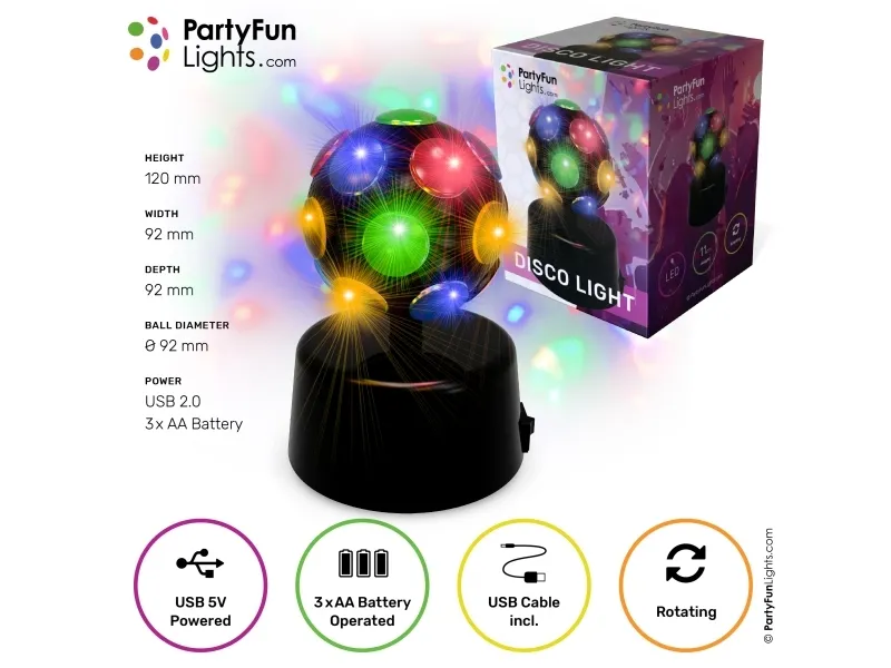 Forvandl ethvert rum til et diskotek med denne mini disko kugle. Lysende LED'er skaber fantastiske lysmønstre på loftet og væggene. Lampen har en bred projektionsvinkel, så de farverige lysprikker bevæger sig overalt. Diameteren på disko lampen er 6 cm. Tilslut blot USB-strømkablet eller brug 3 x AA batterier (medfølger ikke), og kom i gang med festen. Med denne mini disko kugle løfter du din fest til et nyt niveau!