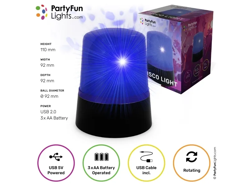 Er du klar til at løfte stemningen til din næste fest? Med denne blå blinkende lampe kan du forvandle ethvert rum til en spændende dansezone eller et festligt gerningssted! De klare LED-lys skaber imponerende mønstre på loft og vægge. mens den brede projektionsvinkel sørger for. at de farverige lys bevæger sig overalt. Lampen har en diameter på 9.2 cm og er perfekt til temafester. hvor du kan signalere starten på dansen med et dramatisk blåt blink. Tilslut blot USB-strømkablet eller brug 3 x AA batterier (medfølger ikke) og ryk ud til fest!