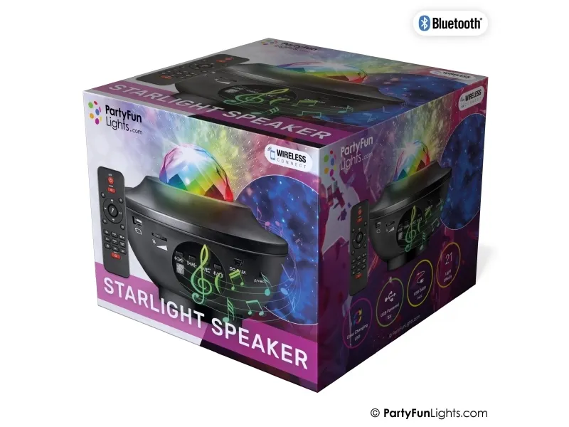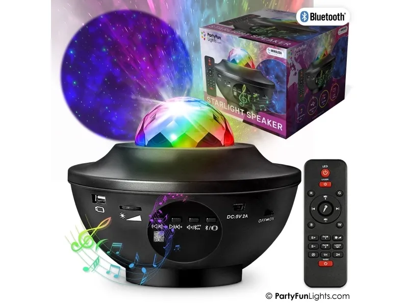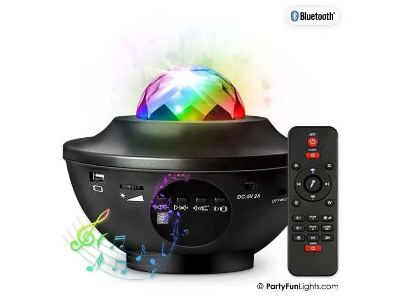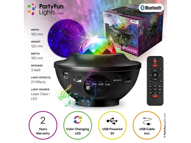 Fyld dit rum med flotte galakse lys- og lasereffekter samt din yndlingsmusik. Denne alt-i-en-enhed har det hele. Du kan afspille dine sange trådløst via din smartphone eller en anden Bluetooth-enhed. Alternativt kan du bruge en USB 2.0-indgang til at afspille din musik fra en memory stick. De kraftige LED'er skaber sammen med en grøn laser smukke mønstre i loftet og har en stor rækkevidde. Med fjernbetjeningen kan du vælge mellem 21 lysmønstre. der består af lydaktive og gradvist falmende mønstre. Fjernbetjeningen bruger 2 stk. AAA batterier (medfølger ikke).