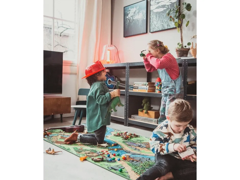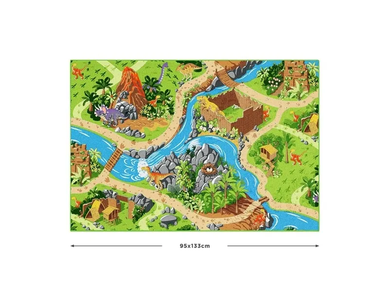 Træd ind i en forhistorisk verden med Rebel Roads Dino Legetæppe! Dette farverige og detaljerede tæppe bringer et spændende dinosaur-univers til live med vulkaner, floder, og eksotiske omgivelser – perfekt til at inspirere dit barns fantasi og eventyrlyst. Ideelt til børneværelset eller legerummet for at skabe en sjov og lærerig atmosfære. Overfladen på legetæppet er lavet af polyamid, mens undersiden er udstyret med skridsikker latex, hvilket sikrer, at tæppet bliver liggende stabilt under leg. Det er nemt at rengøre med en støvsuger og en fugtig klud. Giv dit barn et eventyr i deres eget værelse med Rebel Roads Dino Legetæppe! Mål: 95 x 133 cm. Kendetegn ved REBEL ROADS børnetæpper: • Glade farver og mønstre, der opmuntrer til leg; • Holdbarhed takket være løkkevævning og nylongarn; • Skridsikker bund lavet af latex; • Nem daglig vedligeholdelse, lav luv gør støvsugning lettere og forstyrrer ikke rengøringsrobotter; • Har OEKO-TEX-certifikat, der bekræfter, at produktet er sikkert for både brugere og miljøet; • Egnet til gulvvarme. • Produceret i Europa