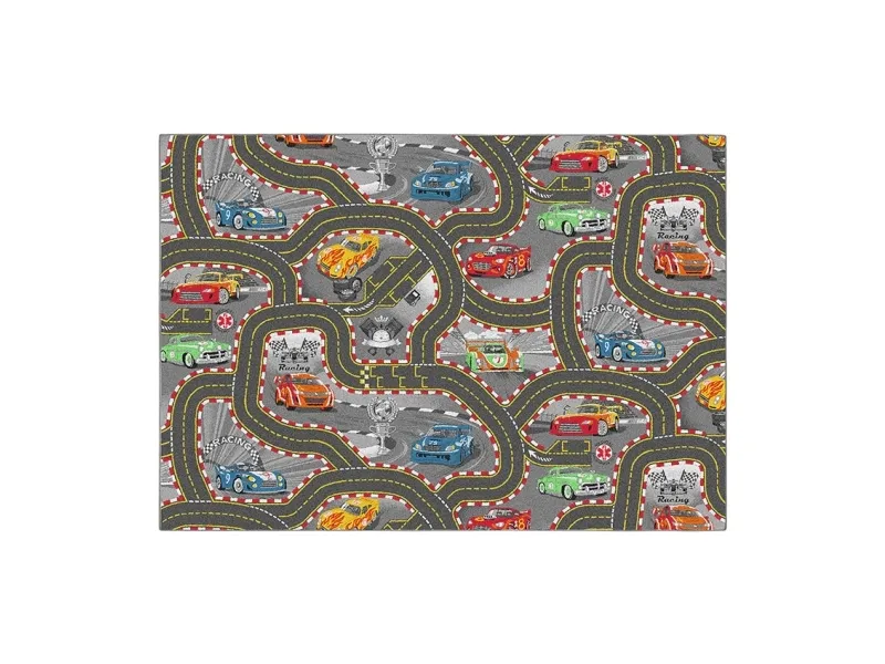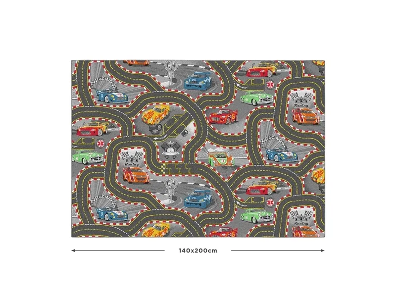 Træd ind i en verden af fart og spænding med Rebel Roads Racerbane Legetæppe! Dette farverige og detaljerede tæppe bringer klassiske racerbiler og snoede racerbaner til live – perfekt til at inspirere dit barns fantasi og kærlighed til hurtige løb. Med skarpe sving, lange strækninger og actionfyldte detaljer er tæppet ideelt til små bilentusiaster. Det passer perfekt i børneværelset eller legerummet og skaber en energisk og sjov atmosfære. Overfladen er lavet af polyamid, mens undersiden er skridsikker takket være latex, så tæppet ligger stabilt under leg. Det er nemt at rengøre med en støvsuger og en fugtig klud. Giv dit barn en verden af racerløb med Rebel Roads Racerbane Legetæppe! Mål: 95 x 133 cm.