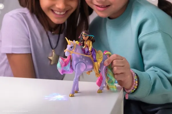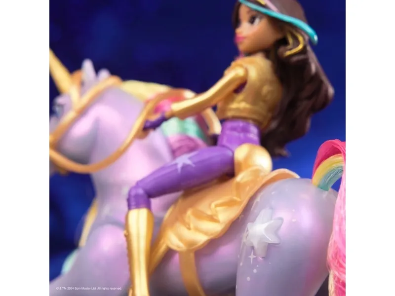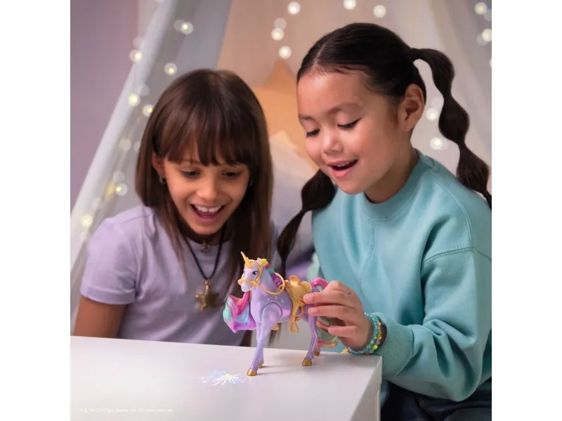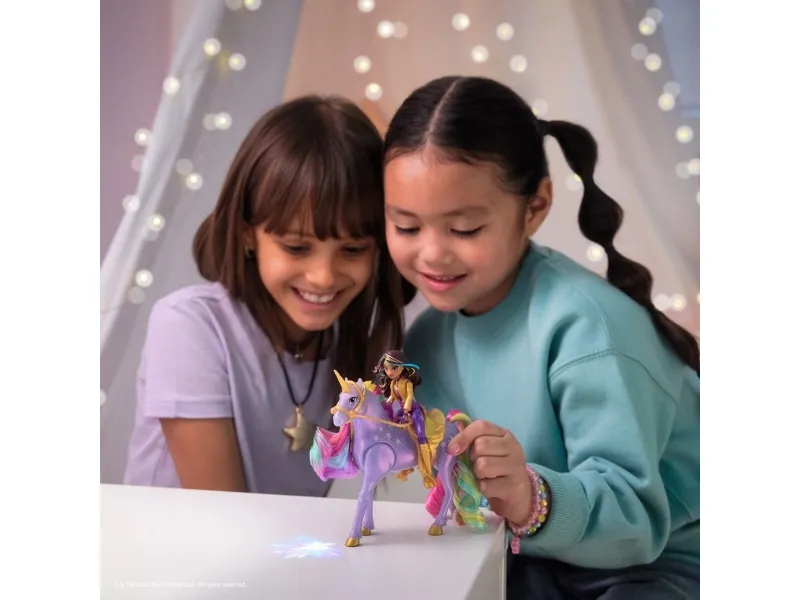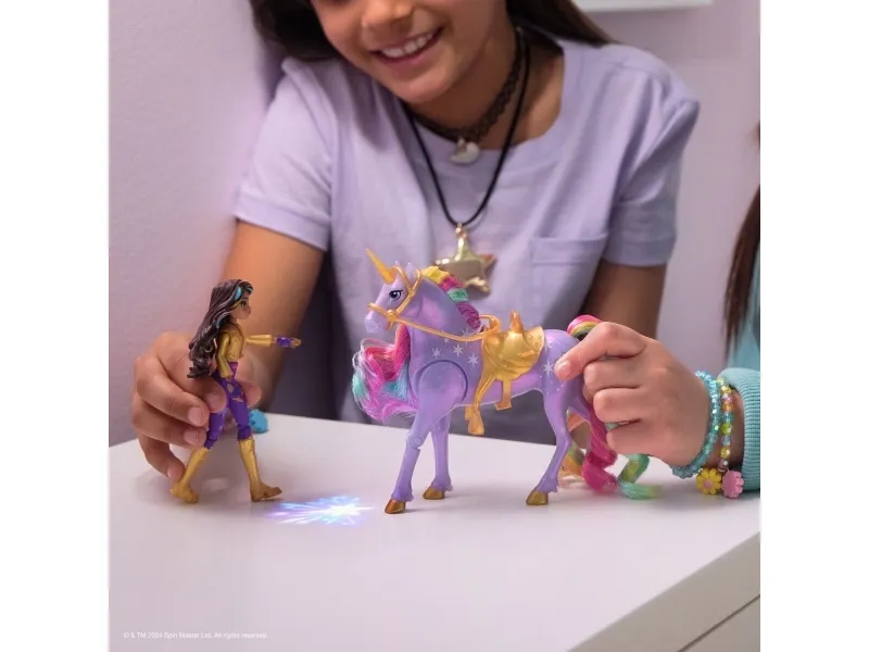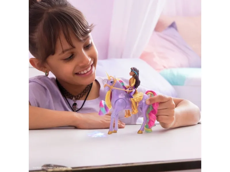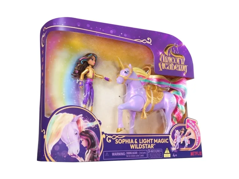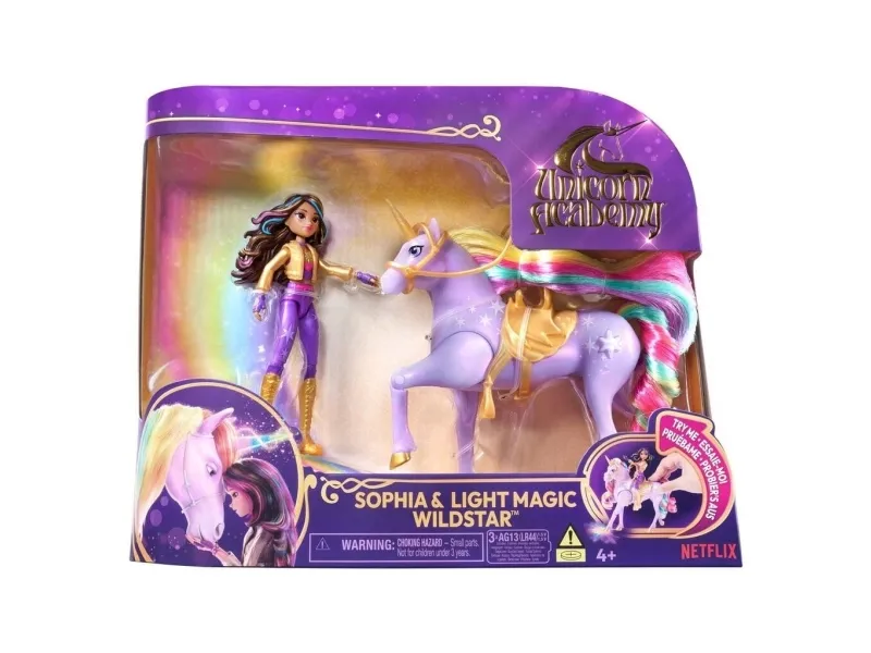 Oplev magien og venskabet fra Enhjørningeakademiet med Sophia & Lysmagi Wildstar legesættet. På enhjørningens side aktiveres det magiske lys med et enkelt tryk på stjerneknappen, mens du genskaber dine yndlingsscener fra serien. Med sin blød regnbuefarvede manke og hale samt magiske lyseffekter på Wildstar, sparker sættet gang i fortryllende fantasileg. Wildstar tramper med sin hov og bruger sin lysmagi til at projicere et regnbue-mønster, præcis som i serien. Sophia kan med sine 7 bevægelige led nemt ride på Wildstar, hvor hun sidder sikkert med det aftagelige hovedtøj og sadeltilbehør. Inspireret af NETFLIX's aninmationsserie og bestseller bøger, hvor venskab blomstrer, bringes figurerne fra Enhjørningeakademiet til live. Oplev og udvid din verden med modedukker, enhjørninge eller de små dukker og legesæt fra Enhjørningeakademiet (sælges separat). Til børn, der elsker enhjørninge, hestelegetøj, dukker og tilbehør, dukkehuse, samleobjekter, plyslegetøj og mere, er legetøj fra Enhjørningeakadamiet en perfekt gave til enhver anledning. Oplev fortryllende Enhjørningeakademieventyr med Sophia og Lysmagi Wildstar legesættet.