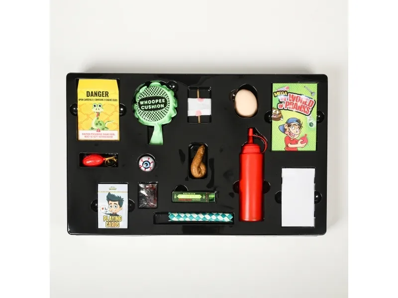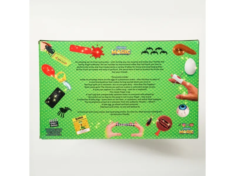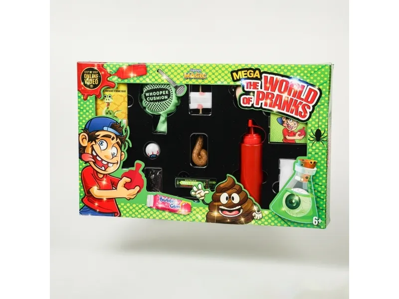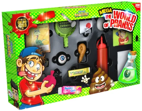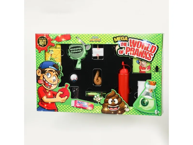 Dette megasæt er det eneste tricks- og drillesæt, du behøver for at overraske dine venner og få familien til at skraldgrine. Fyldt med klassiske gags og sjove, nye overraskelser – det perfekte sæt til endeløs sjov og vilde reaktioner