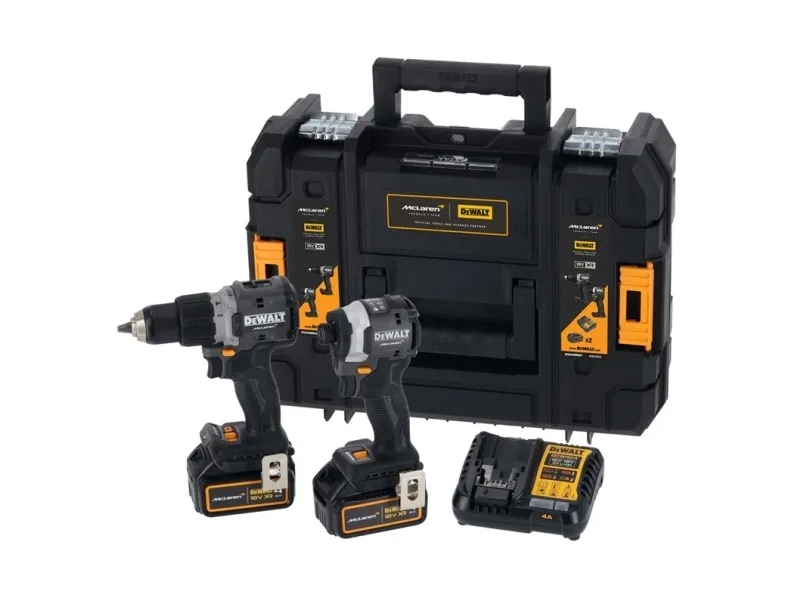 DeWalt McLaren batteri-kombipakning, DCD85M og vidtgående og brede 85M, inkl. 2x batterier og system-lynoplader 18 V batteri-kombipakning, DCD85M og vidtgående og brede 85M, inkl. 2 x batterier (18 volt/4Ah) og system-lynoplader