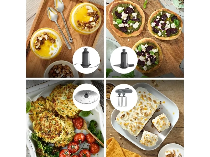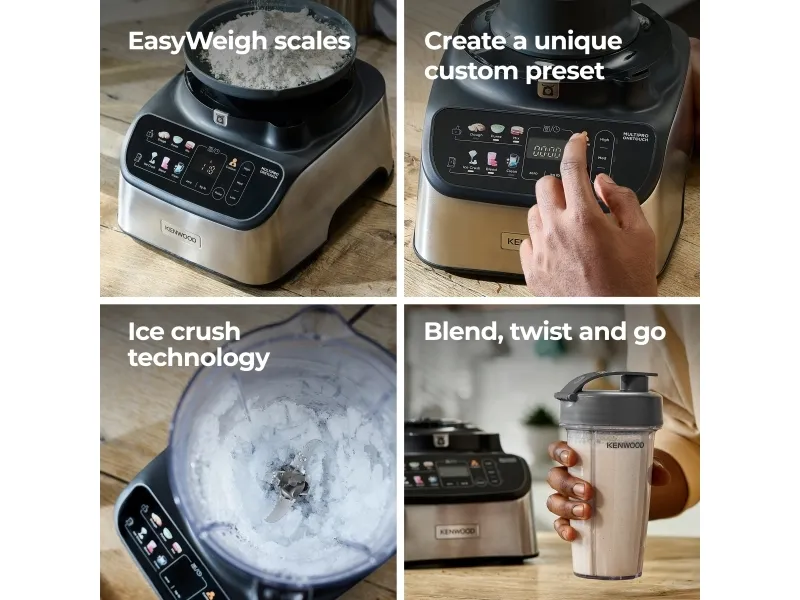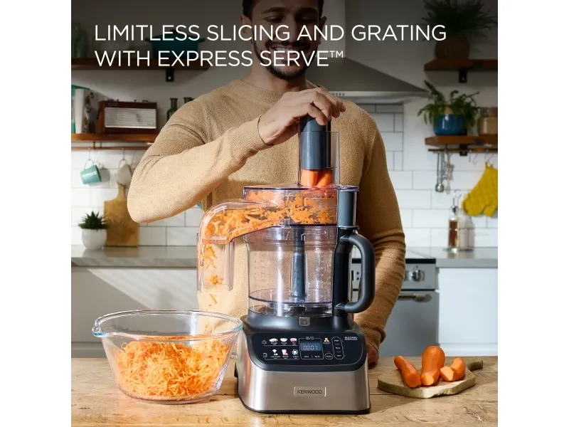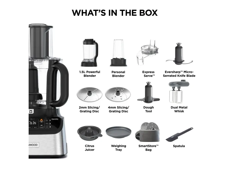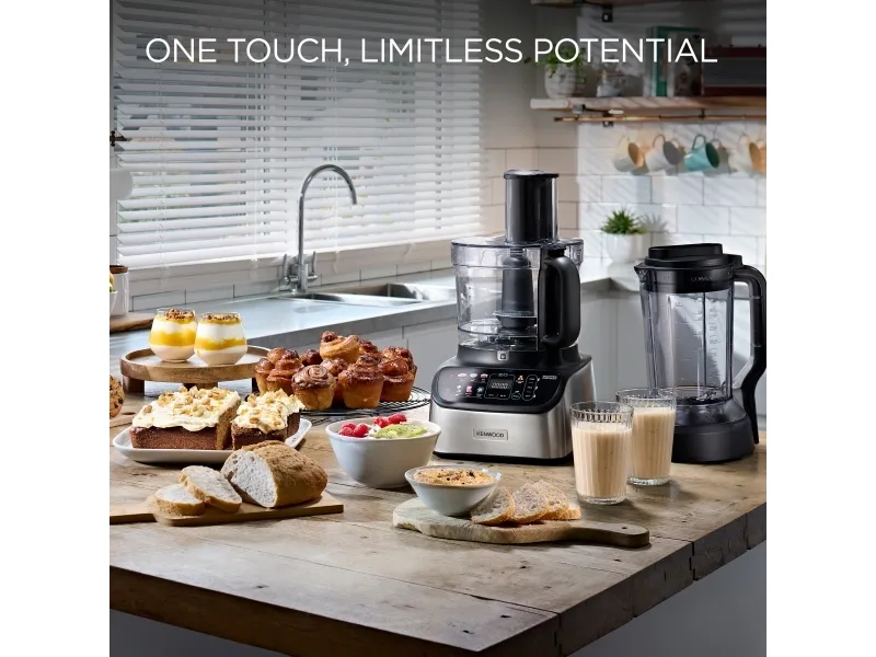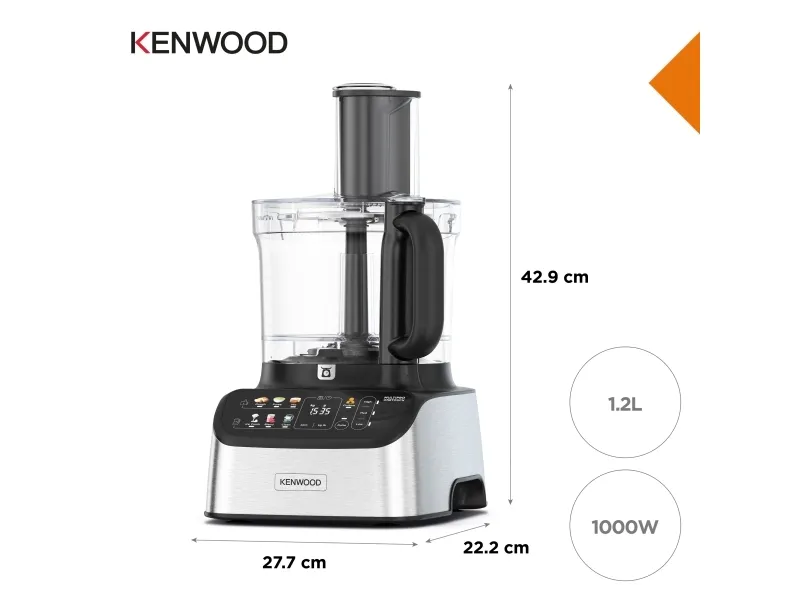 It starts with one touch. With the original all-in-one solution from Kenwood you can weigh, mix, knead, puree, chop, grate, slice, blend, juice, whisk and even crush ice. Includes automatic presets, to prepare ingredients with just one touch, and has a powerful 1000W motor. Kenwood FDM73.850SS. Bowl capacity: 3 L, Product colour: Grey, Control type: Buttons. Display type: LED. Bowl material: Plastic, Blade material: Plastic. Power: 1000 W, Power consumption (typical): 1000 W. Width: 355 mm, Depth: 485 mm, Height: 405 mm