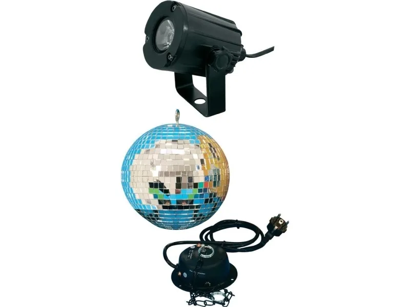 Spejlkugle-sæt 200 mm med LED-spot Den komplette lysfornøjelse i en pakke til en rigtig god pris! Lad dig fortrylle af den romantiske atmosfære fra en spejlkugle i din gildestue. Kugle-dia. 200 mm 3 W Highpower-LED pinspot (6000 K)