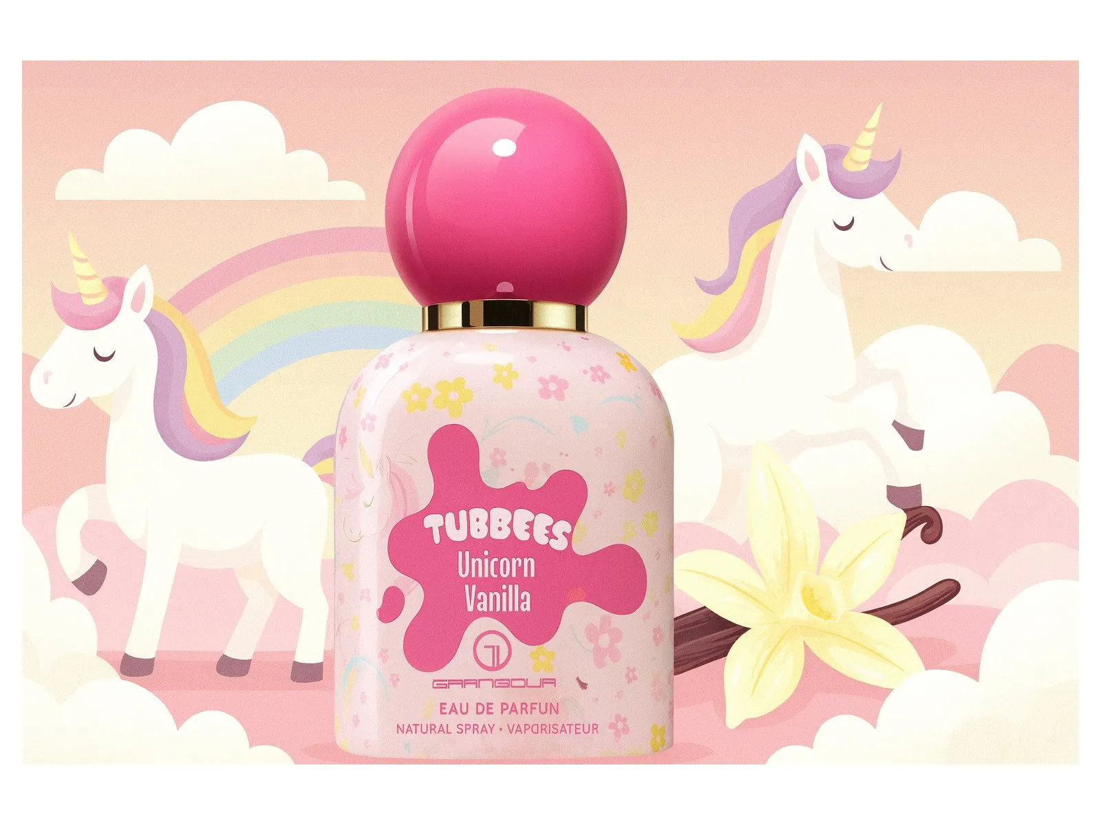 | Duftpyramide & noter Topnoter: acai-bær, citrus, solbær hjertenoter: matcha-te, rose, hvide blomster Basenoter: vanilje, candyfloss (cotton candy), sandeltræ GRANDEUR Tubbees Unicorn Vanilla EDP 50 ml En magisk og sød duft med noter af acai-bær, blomster og cremet vanilje. En legende gourmand-parfume, der spreder glæde og fantasi – som et duftende eventyr i en flaske. |