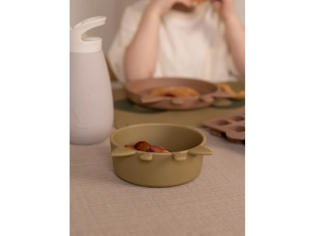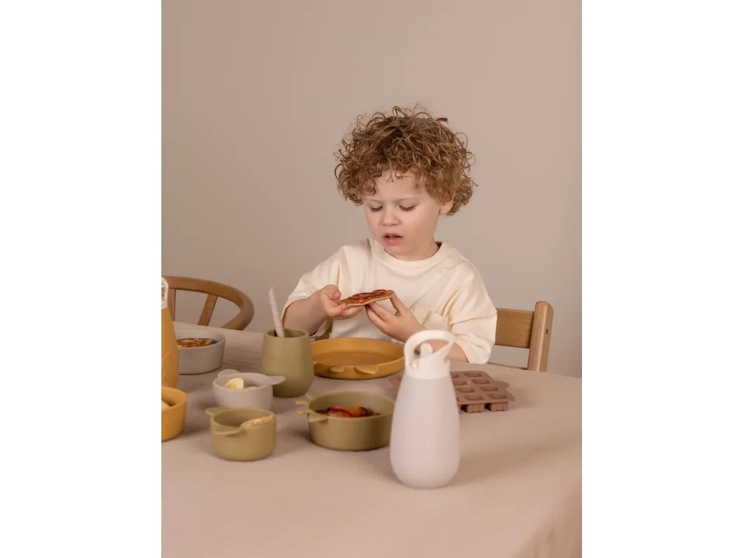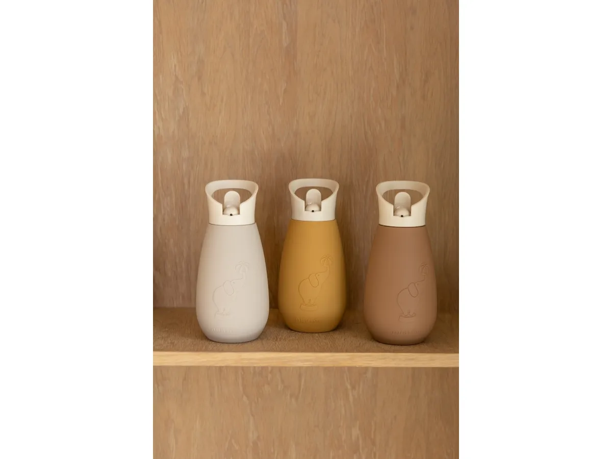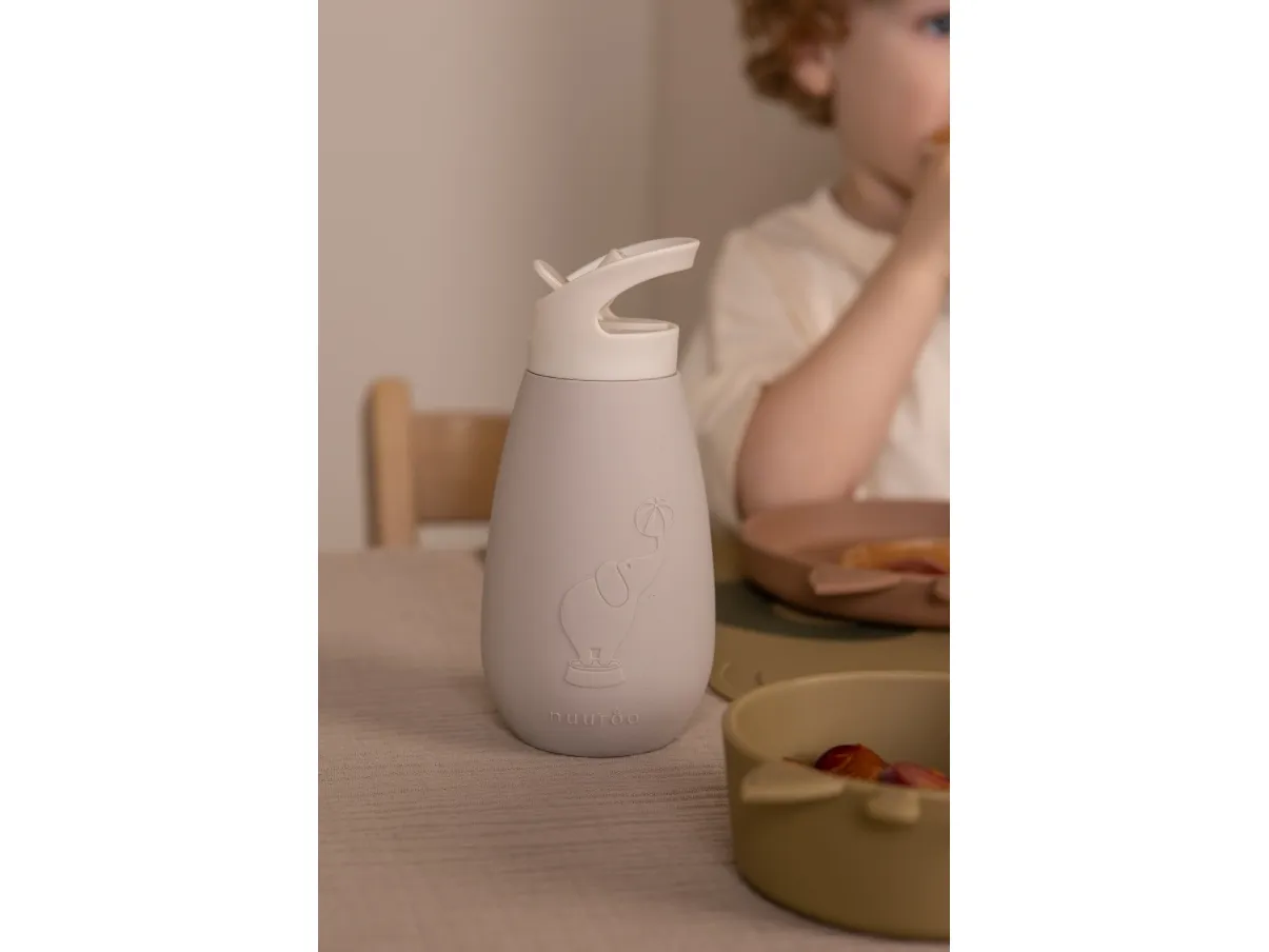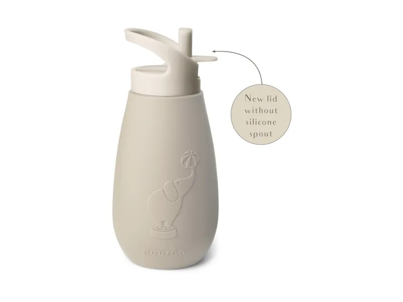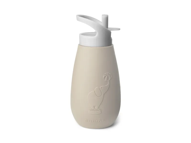 DRIKKEDUNK I SILIKONE Pax drikkedunk med sødt motiv af en cirkuselefant. Flasken er lavet af 100% LFGB silikone, som er uden skadelige kemikalier og godkendt til fødevarer. Låget er lavet af plastik uden ftalater, og slutter helt tæt til flasken.
