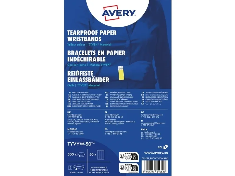 Avery Zweckform TYVYW-50, indtagsbånd, 19 x 256 mm, 5 g/m², 500 armbånd / 50 ark Ekspertens kvalitet: De gule, fortløbende nummererede farvebånd TYVYW-50 i formatet 256 x 19 mm fra Avery Zweckform gør det lettere for dig at organisere arrangementer, møder, seminarer og konferencer. 500 gule indtagsbånd af folie på 50 ark.
