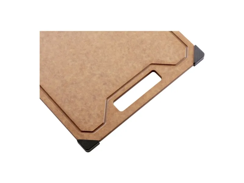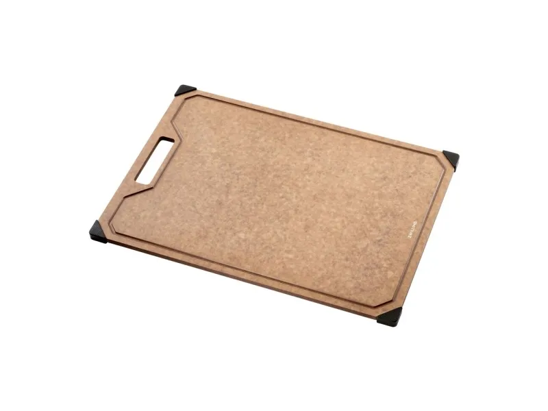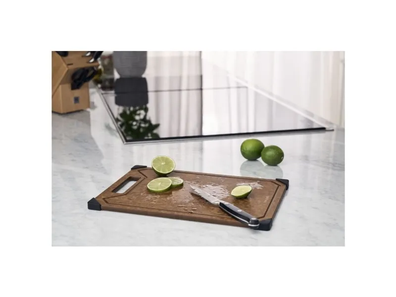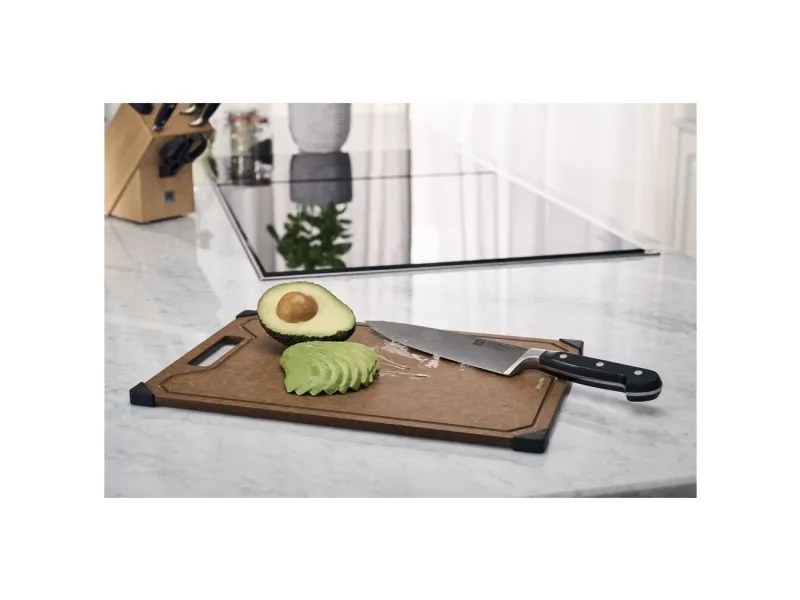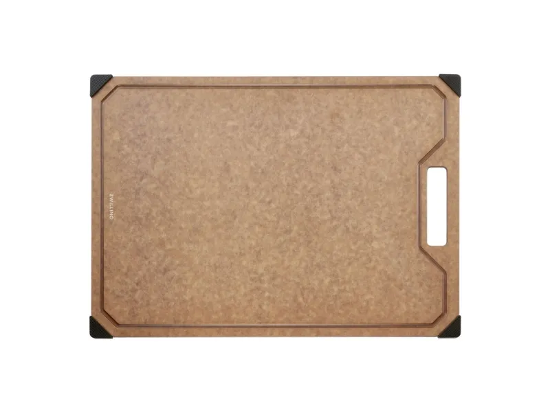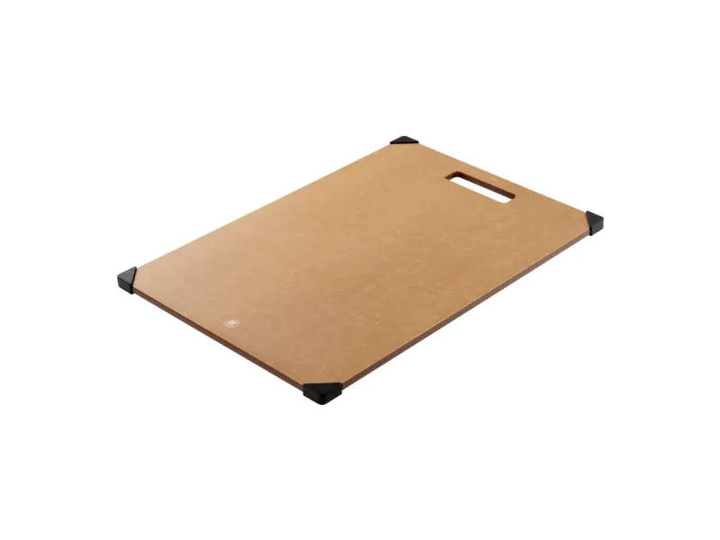 Opdag et uundværligt køkkenredskab: skærebrættet fra ZWILLING. Med det moderne design af det elegante trælaminat bringer dette skærebræt stil og funktionalitet ind i dit køkken. Det ekstra tynde design gør det nemt at håndtere og sparer plads. Skærebrættet er skånsomt mod dine knive, da overfladen let ridses, når du skærer. Det er robust og varmebestandigt, så det kan klare selv det hårdeste arbejde. Den praktiske saftrille på den ene side forhindrer, at væske løber over, og sikrer renlighed, når der skæres. Brættet tåler desuden opvaskemaskine og er nemt at rengøre. De skridsikre silikonefødder giver et sikkert greb på enhver overflade, så skærebrættet altid ligger stabilt.