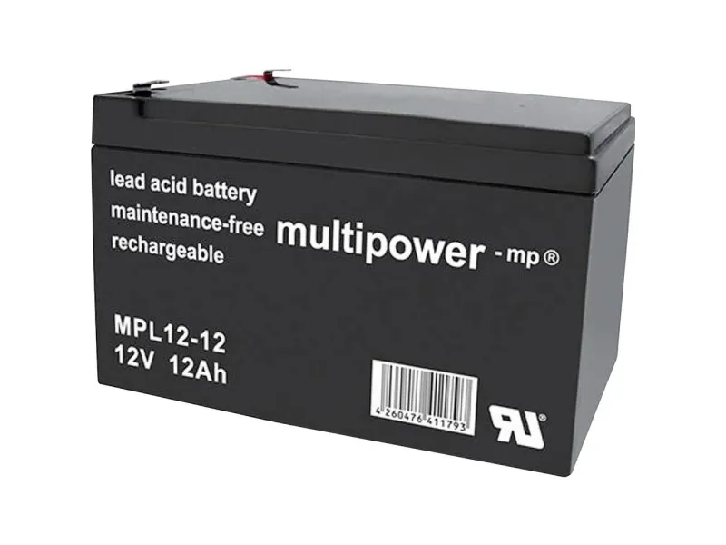 Blybatteri MPL12-12 Lille selvafladning · Vedligeholdelsesfri · Stabilt kabinet af ABS-plast · Tilslutninger med høj ledeevne · Høj effekttæthed Vedligeholdelsesfri og lukket bly-batteri med lang levetid og lav selvafladning. Longlife Lille selvafladning Vedligeholdelsesfri
