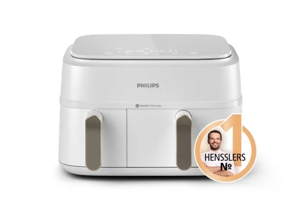 The Philips Series 3000 double hot air fryer NA353 features a spacious 9-liter capacity, making it suitable for cooking larger meals or entertaining family and friends. With advanced Rapid Air technology, it ensures even cooking with crispy results, reducing the need for oil. The easy-to-use touch-sensitive control allows for adjustable settings, making it simple to select from 8 pre-programmed cooking functions, whether you are reheating, preparing meat, or whipping up fresh french fries. Safety is paramount with cool touch housing and cold handles, ensuring safe operation while cooking.